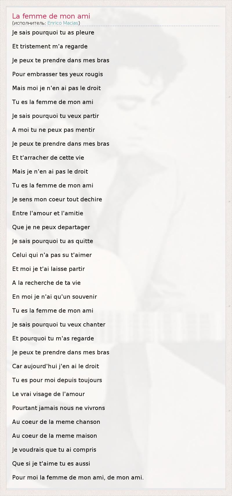 Je sais pourquoi tu as pleure Et tristement m'a regarde Je peux te prendre dans mes bras Pour embrasser tes yeux rougis Mais moi je n'en ai pas le droit Tu es la femme de mon ami Je sais pourquoi tu veux partir A moi tu ne peux pas mentir Je peux te prendre dans mes bras Et t'arracher de cette vie Mais je n'en ai pas le droit Tu es la femme de mon ami Je sens mon coeur tout dechire Entre l'amour et l'amitie Que je ne peux departager Je sais pourquoi tu as quitte Celui qui n'a pas su t'aimer Et moi je t'ai laisse partir A la recherche de ta vie En moi je n'ai qu'un souvenir Tu es la femme de mon ami Je sais pourquoi tu veux chanter Et pourquoi tu m'as regarde Je peux te prendre dans mes bras Car aujourd'hui j'en ai le droit Tu es pour moi depuis toujours Le vrai visage de l'amour Pourtant jamais nous ne vivrons Au coeur de la meme chanson Au coeur de la meme maison Je voudrais que tu ai compris Que si je t'aime tu es aussi Pour moi la femme de mon ami, de mon ami.