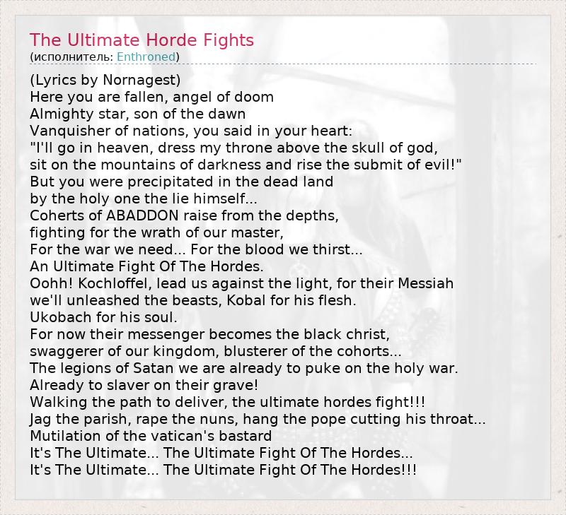 (Lyrics by Nornagest) Here you are fallen, angel of doom Almighty star, son of the dawn Vanquisher of nations, you said in your heart: "I'll go in heaven, dress my throne above the skull of god, sit on the mountains of darkness and rise the submit of evil!" But you were precipitated in the dead land by the holy one the lie himself... Coherts of ABADDON raise from the depths, fighting for the wrath of our master, For the war we need... For the blood we thirst... An Ultimate Fight Of The Hordes. Oohh! Kochloffel, lead us against the light, for their Messiah we'll unleashed the beasts, Kobal for his flesh. Ukobach for his soul. For now their messenger becomes the black christ, swaggerer of our kingdom, blusterer of the cohorts... The legions of Satan we are already to puke on the holy war. Already to slaver on their grave! Walking the path to deliver, the ultimate hordes fight!!! Jag the parish, rape the nuns, hang the pope cutting his throat... Mutilation of the vatican's bastard It's The Ultimate... The Ultimate Fight Of The Hordes... It's The Ultimate... The Ultimate Fight Of The Hordes!!!