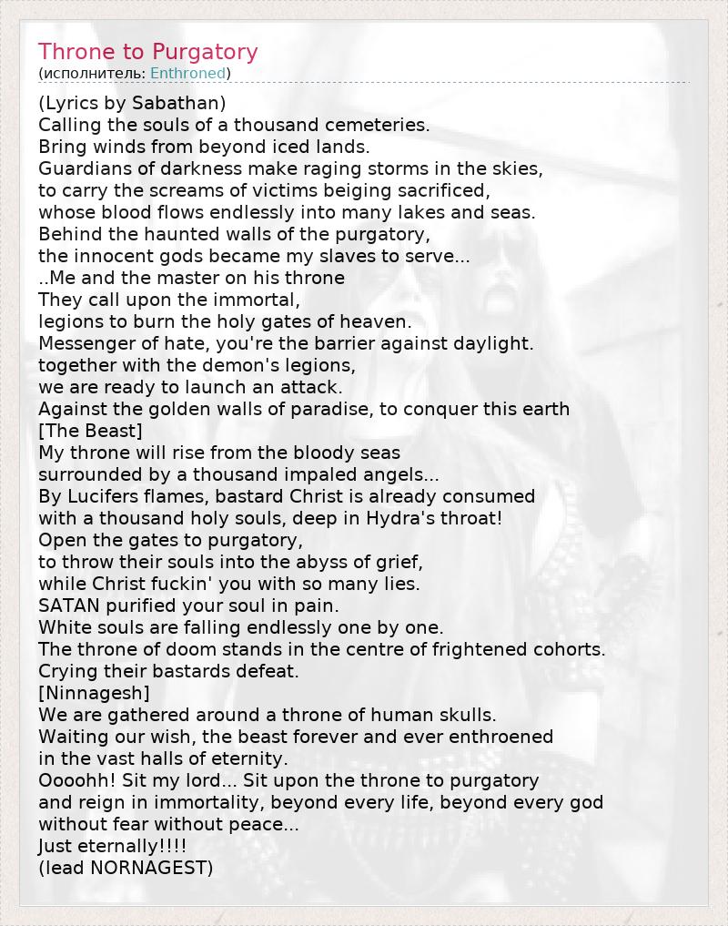 (Lyrics by Sabathan) Calling the souls of a thousand cemeteries. Bring winds from beyond iced lands. Guardians of darkness make raging storms in the skies, to carry the screams of victims beiging sacrificed, whose blood flows endlessly into many lakes and seas. Behind the haunted walls of the purgatory, the innocent gods became my slaves to serve... ..Me and the master on his throne They call upon the immortal, legions to burn the holy gates of heaven. Messenger of hate, you're the barrier against daylight. together with the demon's legions, we are ready to launch an attack. Against the golden walls of paradise, to conquer this earth [The Beast] My throne will rise from the bloody seas surrounded by a thousand impaled angels... By Lucifers flames, bastard Christ is already consumed with a thousand holy souls, deep in Hydra's throat! Open the gates to purgatory, to throw their souls into the abyss of grief, while Christ fuckin' you with so many lies. SATAN purified your soul in pain. White souls are falling endlessly one by one. The throne of doom stands in the centre of frightened cohorts. Crying their bastards defeat. [Ninnagesh] We are gathered around a throne of human skulls. Waiting our wish, the beast forever and ever enthroened in the vast halls of eternity. Oooohh! Sit my lord... Sit upon the throne to purgatory and reign in immortality, beyond every life, beyond every god without fear without peace... Just eternally!!!! (lead NORNAGEST)