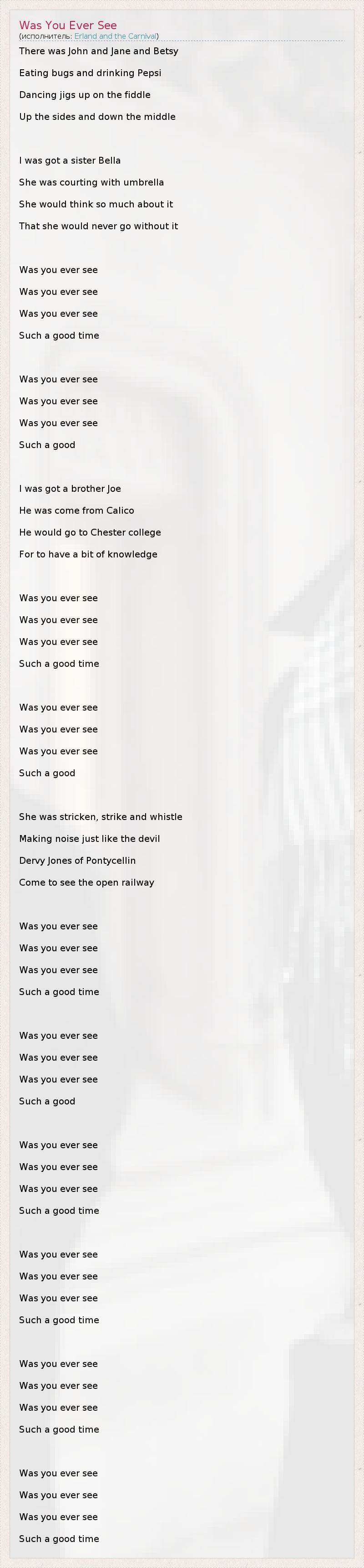 There was John and Jane and Betsy Eating bugs and drinking Pepsi Dancing jigs up on the fiddle Up the sides and down the middle I was got a sister Bella She was courting with umbrella She would think so much about it That she would never go without it Was you ever see Was you ever see Was you ever see Such a good time Was you ever see Was you ever see Was you ever see Such a good I was got a brother Joe He was come from Calico He would go to Chester college For to have a bit of knowledge Was you ever see Was you ever see Was you ever see Such a good time Was you ever see Was you ever see Was you ever see Such a good She was stricken, strike and whistle Making noise just like the devil Dervy Jones of Pontycellin Come to see the open railway Was you ever see Was you ever see Was you ever see Such a good time Was you ever see Was you ever see Was you ever see Such a good Was you ever see Was you ever see Was you ever see Such a good time Was you ever see Was you ever see Was you ever see Such a good time Was you ever see Was you ever see Was you ever see Such a good time Was you ever see Was you ever see Was you ever see Such a good time