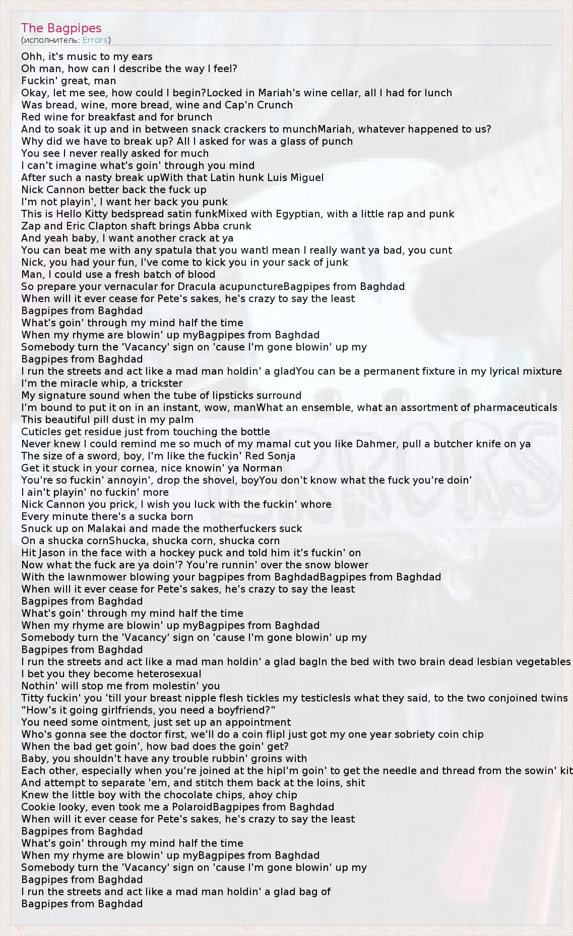Ohh, it's music to my ears Oh man, how can I describe the way I feel? Fuckin' great, man Okay, let me see, how could I begin?Locked in Mariah's wine cellar, all I had for lunch Was bread, wine, more bread, wine and Cap'n Crunch Red wine for breakfast and for brunch And to soak it up and in between snack crackers to munchMariah, whatever happened to us? Why did we have to break up? All I asked for was a glass of punch You see I never really asked for much I can't imagine what's goin' through you mind After such a nasty break upWith that Latin hunk Luis Miguel Nick Cannon better back the fuck up I'm not playin', I want her back you punk This is Hello Kitty bedspread satin funkMixed with Egyptian, with a little rap and punk Zap and Eric Clapton shaft brings Abba crunk And yeah baby, I want another crack at ya You can beat me with any spatula that you wantI mean I really want ya bad, you cunt Nick, you had your fun, I've come to kick you in your sack of junk Man, I could use a fresh batch of blood So prepare your vernacular for Dracula acupunctureBagpipes from Baghdad When will it ever cease for Pete's sakes, he's crazy to say the least Bagpipes from Baghdad What's goin' through my mind half the time When my rhyme are blowin' up myBagpipes from Baghdad Somebody turn the 'Vacancy' sign on 'cause I'm gone blowin' up my Bagpipes from Baghdad I run the streets and act like a mad man holdin' a gladYou can be a permanent fixture in my lyrical mixture I'm the miracle whip, a trickster My signature sound when the tube of lipsticks surround I'm bound to put it on in an instant, wow, manWhat an ensemble, what an assortment of pharmaceuticals This beautiful pill dust in my palm Cuticles get residue just from touching the bottle Never knew I could remind me so much of my mamaI cut you like Dahmer, pull a butcher knife on ya The size of a sword, boy, I'm like the fuckin' Red Sonja Get it stuck in your cornea, nice knowin' ya Norman You're so fuckin' annoyin', drop the shovel, boyYou don't know what the fuck you're doin' I ain't playin' no fuckin' more Nick Cannon you prick, I wish you luck with the fuckin' whore Every minute there's a sucka born Snuck up on Malakai and made the motherfuckers suck On a shucka cornShucka, shucka corn, shucka corn Hit Jason in the face with a hockey puck and told him it's fuckin' on Now what the fuck are ya doin'? You're runnin' over the snow blower With the lawnmower blowing your bagpipes from BaghdadBagpipes from Baghdad When will it ever cease for Pete's sakes, he's crazy to say the least Bagpipes from Baghdad What's goin' through my mind half the time When my rhyme are blowin' up myBagpipes from Baghdad Somebody turn the 'Vacancy' sign on 'cause I'm gone blowin' up my Bagpipes from Baghdad I run the streets and act like a mad man holdin' a glad bagIn the bed with two brain dead lesbian vegetables I bet you they become heterosexual Nothin' will stop me from molestin' you Titty fuckin' you 'till your breast nipple flesh tickles my testiclesIs what they said, to the two conjoined twins "How's it going girlfriends, you need a boyfriend?" You need some ointment, just set up an appointment Who's gonna see the doctor first, we'll do a coin flipI just got my one year sobriety coin chip When the bad get goin', how bad does the goin' get? Baby, you shouldn't have any trouble rubbin' groins with Each other, especially when you're joined at the hipI'm goin' to get the needle and thread from the sowin' kit And attempt to separate 'em, and stitch them back at the loins, shit Knew the little boy with the chocolate chips, ahoy chip Cookie looky, even took me a PolaroidBagpipes from Baghdad When will it ever cease for Pete's sakes, he's crazy to say the least Bagpipes from Baghdad What's goin' through my mind half the time When my rhyme are blowin' up myBagpipes from Baghdad Somebody turn the 'Vacancy' sign on 'cause I'm gone blowin' up my Bagpipes from Baghdad I run the streets and act like a mad man holdin' a glad bag of Bagpipes from Baghdad