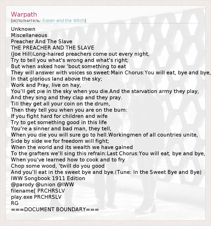 Unknown Miscellaneous Preacher And The Slave THE PREACHER AND THE SLAVE (Joe HilI)Long-haired preachers come out every night, Try to tell you what's wrong and what's right; But when asked how 'bout something to eat They will answer with voices so sweet:Main Chorus:You will eat, bye and bye, In that glorious land above the sky; Work and Pray, live on hay, You'll get pie in the sky when you die.And the starvation army they play, And they sing and they clap and they pray. Till they get all your coin on the drum, Then they tell you when you are on the bum: If you fight hard for children and wife Try to get something good in this life You're a sinner and bad man, they tell, When you die you will sure go to hell.Workingmen of all countries unite, Side by side we for freedom will fight; When the world and its wealth we have gained To the grafters we'll sing this refrain:Last Chorus:You will eat, bye and bye, When you've learned how to cook and to fry Chop some wood, 'twill do you good And you'll eat in the sweet bye and bye.(Tune: In the Sweet Bye and Bye) IWW Songbook 1911 Edition @parody @union @IWW filename[ PRCHRSLV play.exe PRCHRSLV RG ===DOCUMENT BOUNDARY===