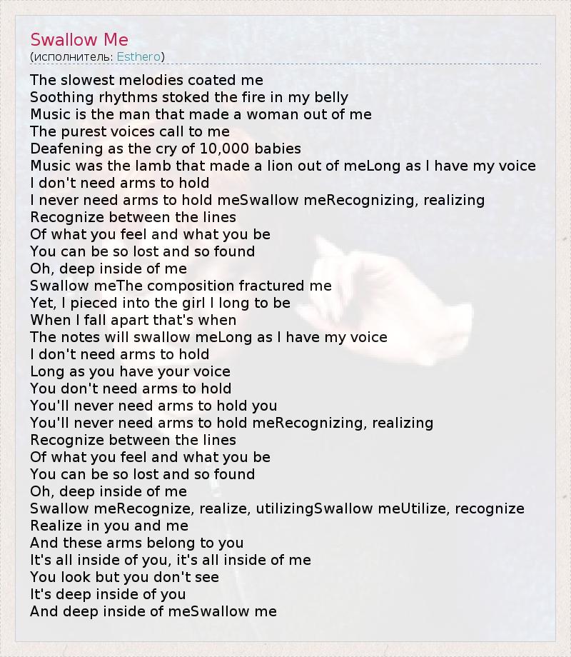 The slowest melodies coated me Soothing rhythms stoked the fire in my belly Music is the man that made a woman out of me The purest voices call to me Deafening as the cry of 10,000 babies Music was the lamb that made a lion out of meLong as I have my voice I don't need arms to hold I never need arms to hold meSwallow meRecognizing, realizing Recognize between the lines Of what you feel and what you be You can be so lost and so found Oh, deep inside of me Swallow meThe composition fractured me Yet, I pieced into the girl I long to be When I fall apart that's when The notes will swallow meLong as I have my voice I don't need arms to hold Long as you have your voice You don't need arms to hold You'll never need arms to hold you You'll never need arms to hold meRecognizing, realizing Recognize between the lines Of what you feel and what you be You can be so lost and so found Oh, deep inside of me Swallow meRecognize, realize, utilizingSwallow meUtilize, recognize Realize in you and me And these arms belong to you It's all inside of you, it's all inside of me You look but you don't see It's deep inside of you And deep inside of meSwallow me