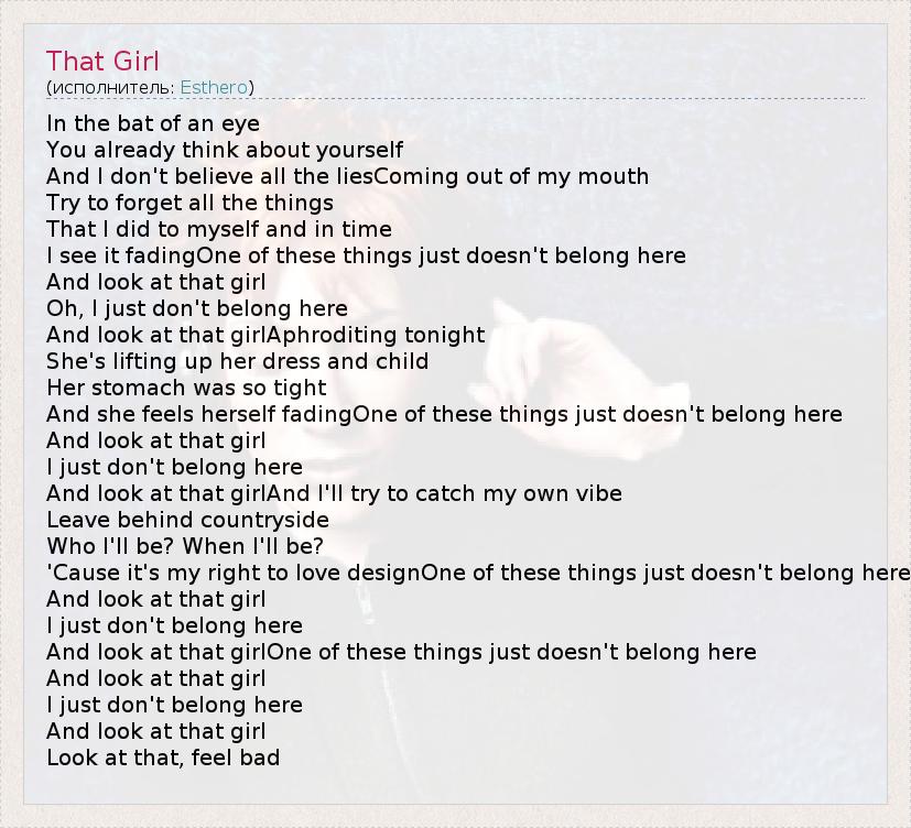 In the bat of an eye You already think about yourself And I don't believe all the liesComing out of my mouth Try to forget all the things That I did to myself and in time I see it fadingOne of these things just doesn't belong here And look at that girl Oh, I just don't belong here And look at that girlAphroditing tonight She's lifting up her dress and child Her stomach was so tight And she feels herself fadingOne of these things just doesn't belong here And look at that girl I just don't belong here And look at that girlAnd I'll try to catch my own vibe Leave behind countryside Who I'll be? When I'll be? 'Cause it's my right to love designOne of these things just doesn't belong here And look at that girl I just don't belong here And look at that girlOne of these things just doesn't belong here And look at that girl I just don't belong here And look at that girl Look at that, feel bad