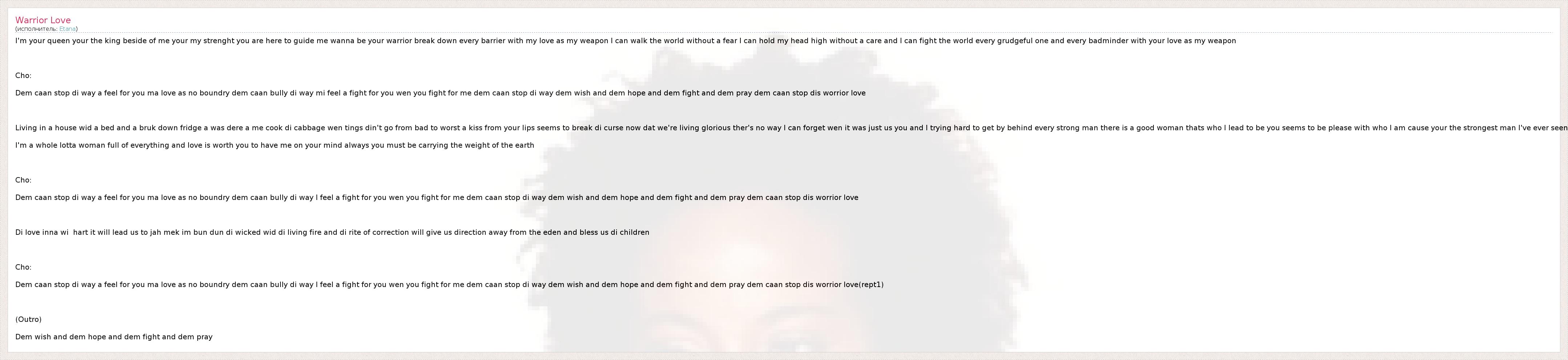Dem caan stop di way a feel for you ma love as no boundry dem caan bully di way I feel a fight for you wen you fight for me dem caan stop di way dem wish and dem hope and dem fight and dem pray dem caan stop dis worrior love(rept1)