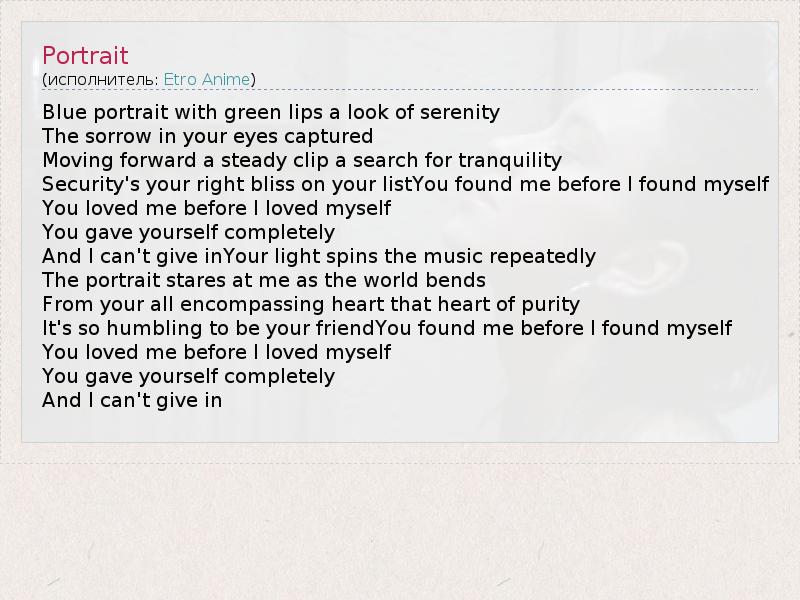 Blue portrait with green lips a look of serenity The sorrow in your eyes captured Moving forward a steady clip a search for tranquility Security's your right bliss on your listYou found me before I found myself You loved me before I loved myself You gave yourself completely And I can't give inYour light spins the music repeatedly The portrait stares at me as the world bends From your all encompassing heart that heart of purity It's so humbling to be your friendYou found me before I found myself You loved me before I loved myself You gave yourself completely And I can't give in