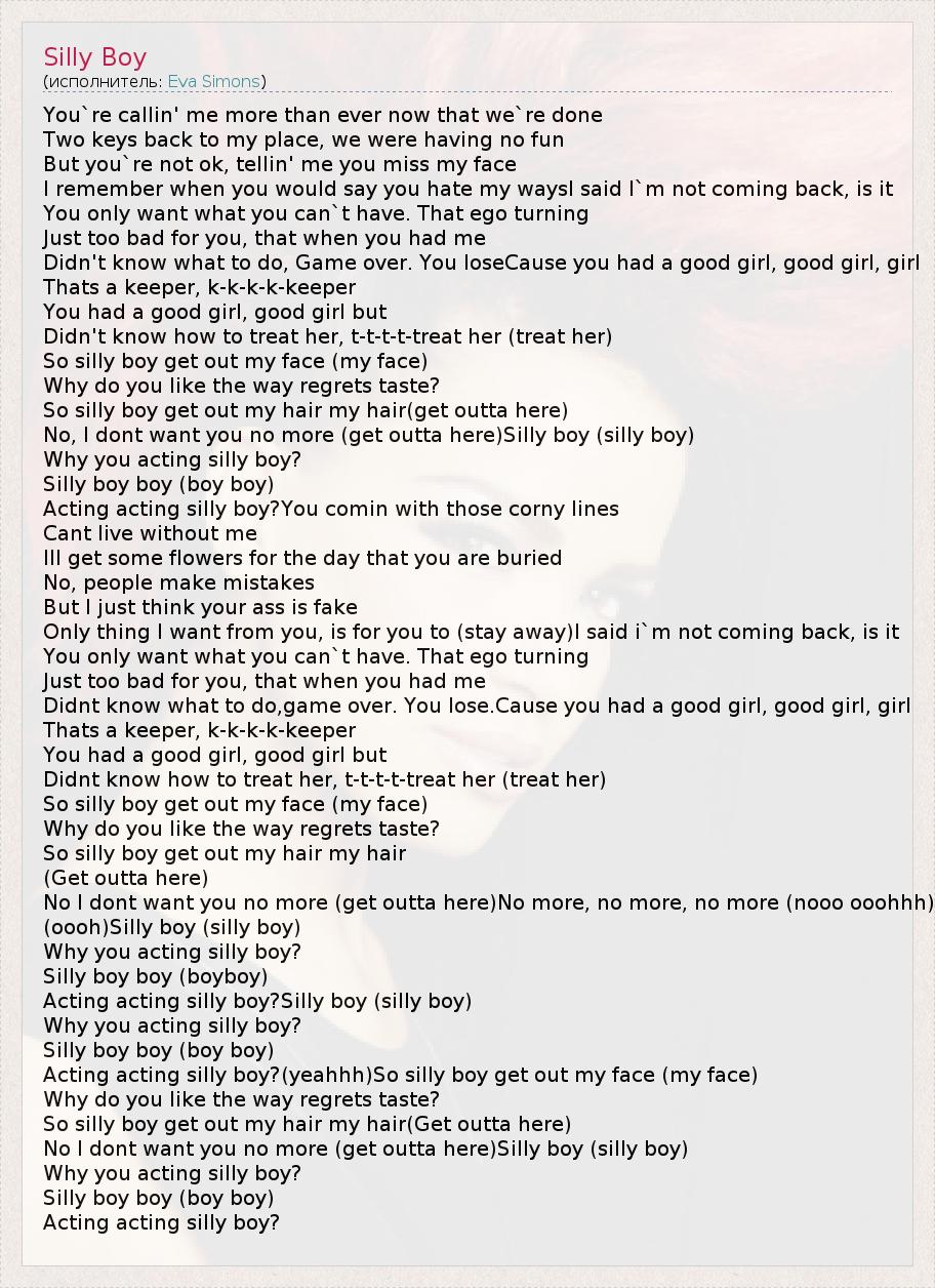 You`re callin' me more than ever now that we`re done Two keys back to my place, we were having no fun But you`re not ok, tellin' me you miss my face I remember when you would say you hate my waysI said I`m not coming back, is it You only want what you can`t have. That ego turning Just too bad for you, that when you had me Didn't know what to do, Game over. You loseCause you had a good girl, good girl, girl Thats a keeper, k-k-k-k-keeper You had a good girl, good girl but Didn't know how to treat her, t-t-t-t-treat her (treat her) So silly boy get out my face (my face) Why do you like the way regrets taste? So silly boy get out my hair my hair(get outta here) No, I dont want you no more (get outta here)Silly boy (silly boy) Why you acting silly boy? Silly boy boy (boy boy) Acting acting silly boy?You comin with those corny lines Cant live without me Ill get some flowers for the day that you are buried No, people make mistakes But I just think your ass is fake Only thing I want from you, is for you to (stay away)I said i`m not coming back, is it You only want what you can`t have. That ego turning Just too bad for you, that when you had me Didnt know what to do,game over. You lose.Cause you had a good girl, good girl, girl Thats a keeper, k-k-k-k-keeper You had a good girl, good girl but Didnt know how to treat her, t-t-t-t-treat her (treat her) So silly boy get out my face (my face) Why do you like the way regrets taste? So silly boy get out my hair my hair (Get outta here) No I dont want you no more (get outta here)No more, no more, no more (nooo ooohhh) (oooh)Silly boy (silly boy) Why you acting silly boy? Silly boy boy (boyboy) Acting acting silly boy?Silly boy (silly boy) Why you acting silly boy? Silly boy boy (boy boy) Acting acting silly boy?(yeahhh)So silly boy get out my face (my face) Why do you like the way regrets taste? So silly boy get out my hair my hair(Get outta here) No I dont want you no more (get outta here)Silly boy (silly boy) Why you acting silly boy? Silly boy boy (boy boy) Acting acting silly boy?