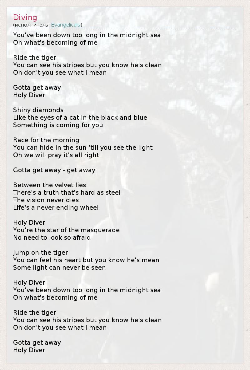 You've been down too long in the midnight sea Oh what's becoming of me Ride the tiger You can see his stripes but you know he's clean Oh don't you see what I mean Gotta get away Holy Diver Shiny diamonds Like the eyes of a cat in the black and blue Something is coming for you Race for the morning You can hide in the sun 'till you see the light Oh we will pray it's all right Gotta get away - get away Between the velvet lies There's a truth that's hard as steel The vision never dies Life's a never ending wheel Holy Diver You're the star of the masquerade No need to look so afraid Jump on the tiger You can feel his heart but you know he's mean Some light can never be seen Holy Diver You've been down too long in the midnight sea Oh what's becoming of me Ride the tiger You can see his stripes but you know he's clean Oh don't you see what I mean Gotta get away Holy Diver