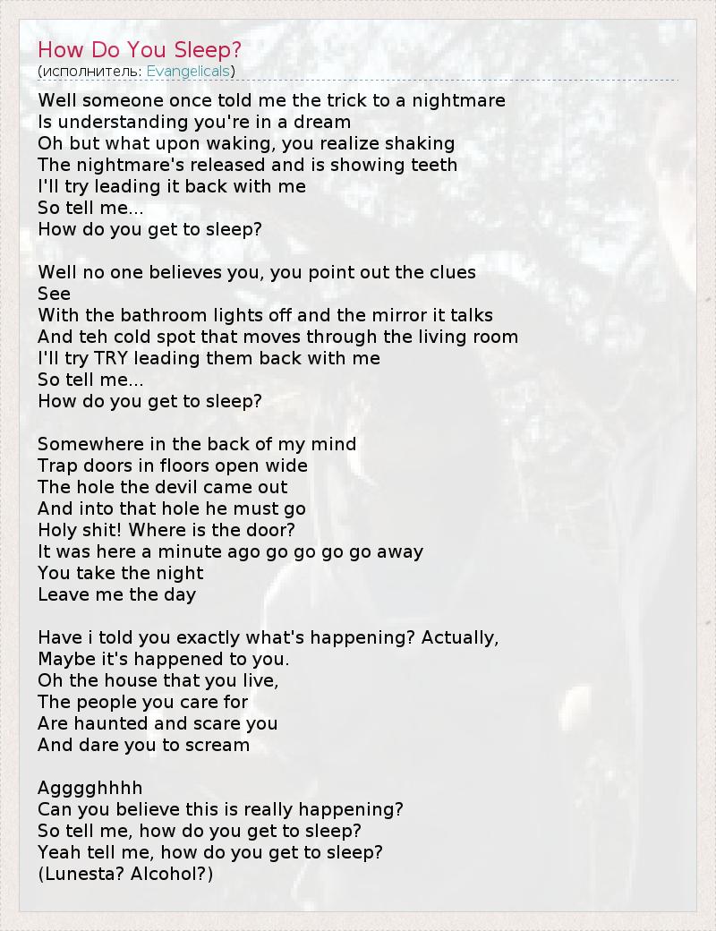 Well someone once told me the trick to a nightmare Is understanding you're in a dream Oh but what upon waking, you realize shaking The nightmare's released and is showing teeth I'll try leading it back with me So tell me... How do you get to sleep? Well no one believes you, you point out the clues See With the bathroom lights off and the mirror it talks And teh cold spot that moves through the living room I'll try TRY leading them back with me So tell me... How do you get to sleep? Somewhere in the back of my mind Trap doors in floors open wide The hole the devil came out And into that hole he must go Holy shit! Where is the door? It was here a minute ago go go go go away You take the night Leave me the day Have i told you exactly what's happening? Actually, Maybe it's happened to you. Oh the house that you live, The people you care for Are haunted and scare you And dare you to scream Agggghhhh Can you believe this is really happening? So tell me, how do you get to sleep? Yeah tell me, how do you get to sleep? (Lunesta? Alcohol?)