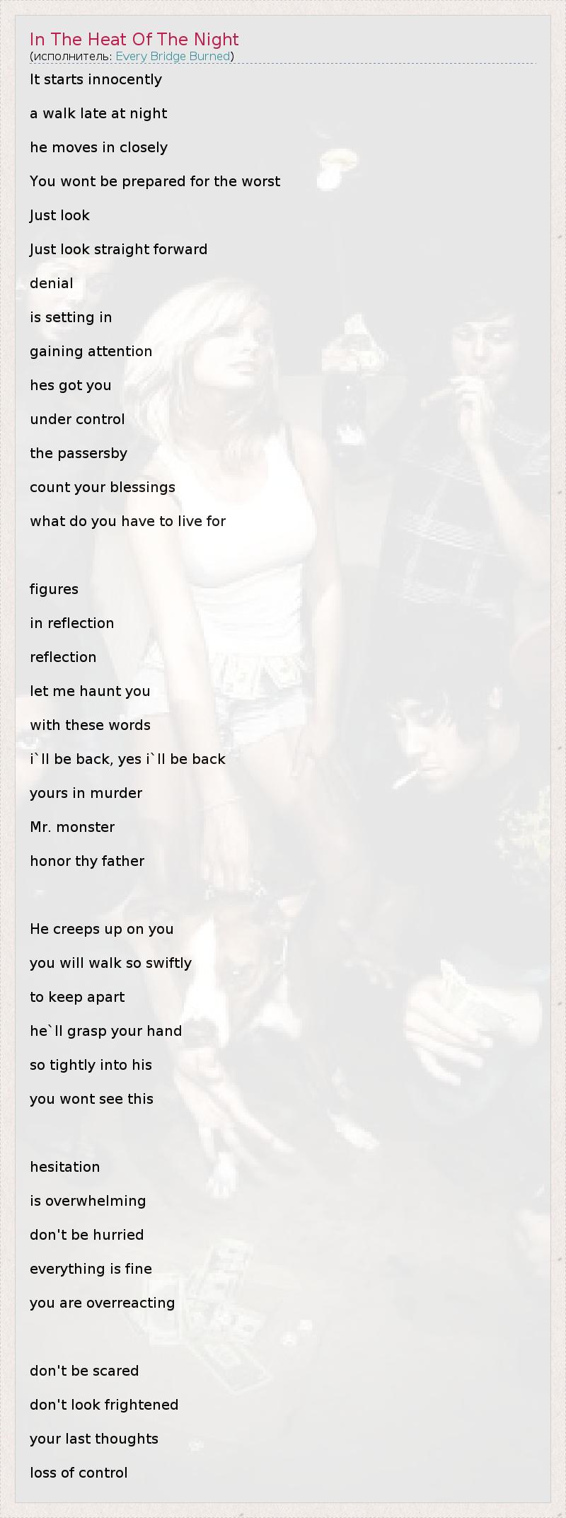 А как ты думаешь, о чем песня "In The Heat Of The Night" ?