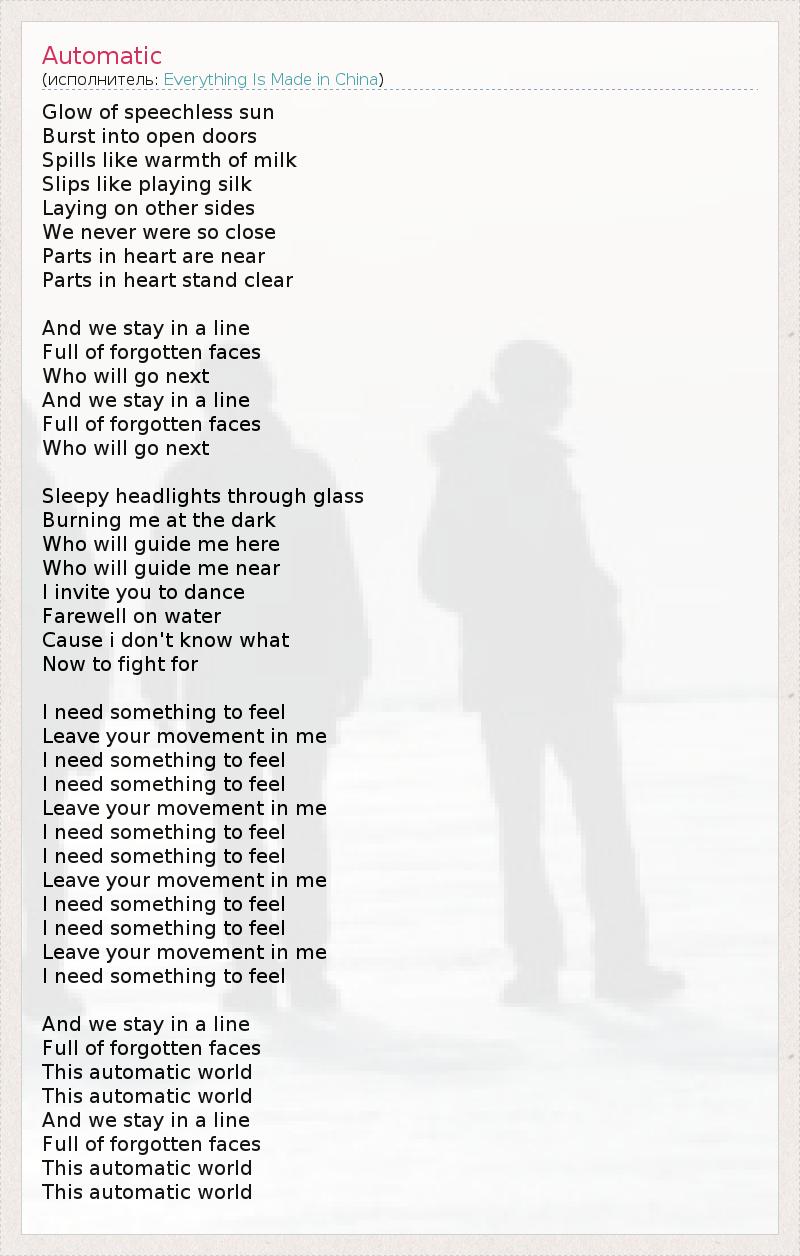 Жар безмолвного солнца Врывается в раскрытые двери, Разливается, как тепло молока, Скользит, как играющий шелк. Стоя на разных берегах, Мы стали ближе, чем когда-либо. Края сходятся в сердце И остаются ясными. Мы стоим в очереди, Полной потерянных лиц. Кто следующий? Мы стоим в очереди, Полной потерянных лиц. Кто следующий? Свет сонных фар обжигает Меня сквозь стекло в темноте. Кто проведет меня здесь? Кто проведет меня рядом? Я приглашаю тебя на танец, Прощание на воде, Потому что я не знаю, Ради чего теперь сражаться. Мне нужно чувствовать что-то, Оставь свои движения во мне. Мне нужно чувствовать что-то, Мне нужно чувствовать что-то. Оставь свои движения во мне. Мне нужно чувствовать что-то, Мне нужно чувствовать что-то. Оставь свои движения во мне. Мне нужно чувствовать что-то, Мне нужно чувствовать что-то. Оставь свои движения во мне. Мне нужно чувствовать что-то. Мы стоим в очереди, Полной потерянных лиц. Этот автоматический мир, Этот автоматический мир. Мы стоим в очереди, Полной потерянных лиц. Этот автоматический мир, Этот автоматический мир.