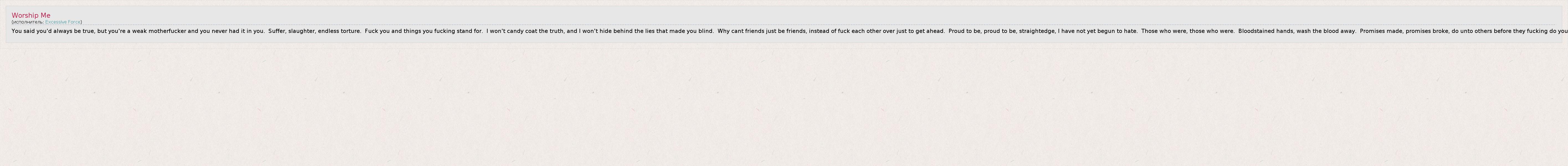 You said you'd always be true, but you're a weak motherfucker and you never had it in you. Suffer, slaughter, endless torture. Fuck you and things you fucking stand for. I won't candy coat the truth, and I won't hide behind the lies that made you blind. Why cant friends just be friends, instead of fuck each other over just to get ahead. Proud to be, proud to be, straightedge, I have not yet begun to hate. Those who were, those who were. Bloodstained hands, wash the blood away. Promises made, promises broke, do unto others before they fucking do you
