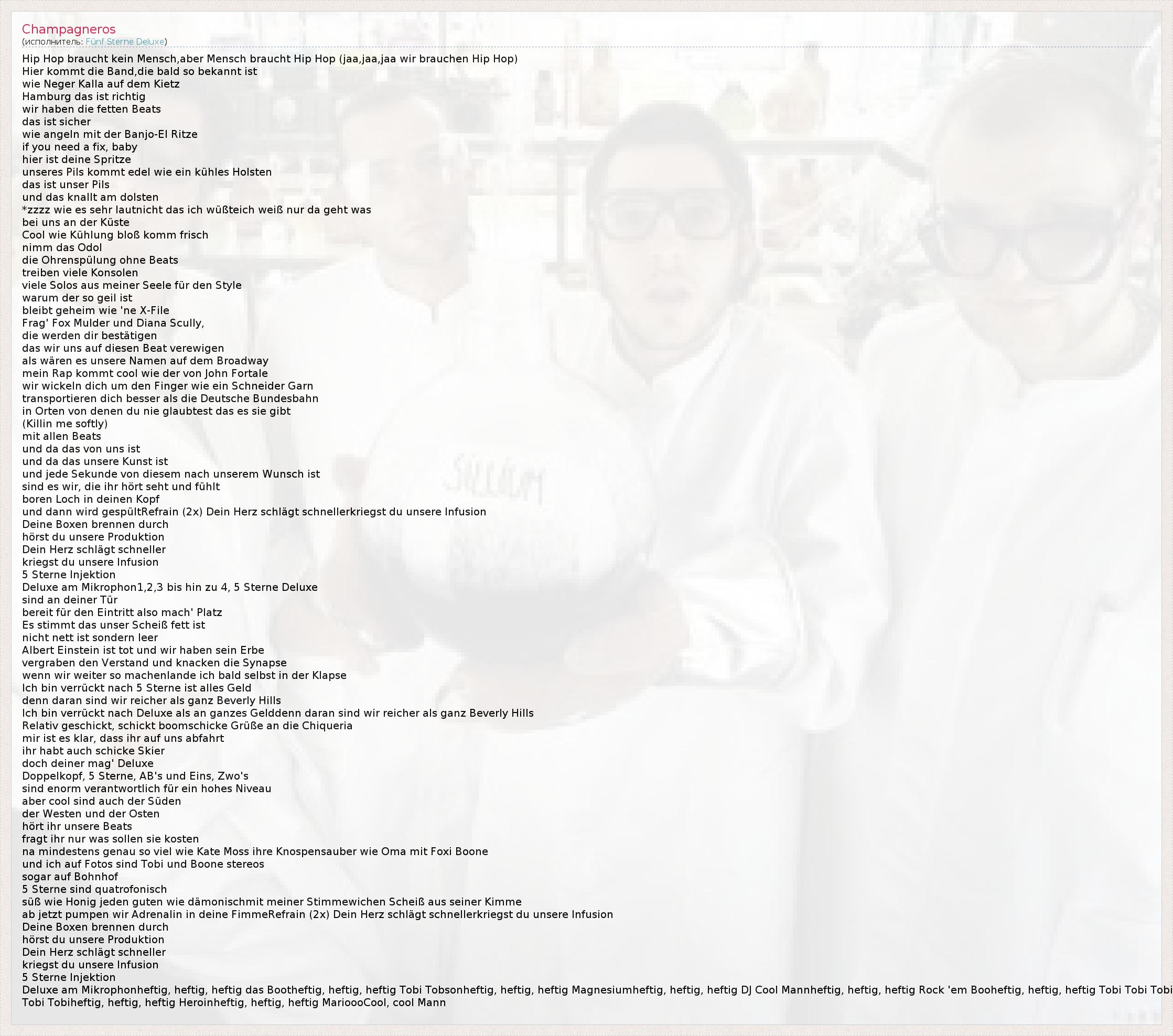 Hip Hop braucht kein Mensch,aber Mensch braucht Hip Hop (jaa,jaa,jaa wir brauchen Hip Hop) Hier kommt die Band,die bald so bekannt ist wie Neger Kalla auf dem Kietz Hamburg das ist richtig wir haben die fetten Beats das ist sicher wie angeln mit der Banjo-El Ritze if you need a fix, baby hier ist deine Spritze unseres Pils kommt edel wie ein kühles Holsten das ist unser Pils und das knallt am dolsten *zzzz wie es sehr lautnicht das ich wüßteich weiß nur da geht was bei uns an der Küste Cool wie Kühlung bloß komm frisch nimm das Odol die Ohrenspülung ohne Beats treiben viele Konsolen viele Solos aus meiner Seele für den Style warum der so geil ist bleibt geheim wie 'ne X-File Frag' Fox Mulder und Diana Scully, die werden dir bestätigen das wir uns auf diesen Beat verewigen als wären es unsere Namen auf dem Broadway mein Rap kommt cool wie der von John Fortale wir wickeln dich um den Finger wie ein Schneider Garn transportieren dich besser als die Deutsche Bundesbahn in Orten von denen du nie glaubtest das es sie gibt (Killin me softly) mit allen Beats und da das von uns ist und da das unsere Kunst ist und jede Sekunde von diesem nach unserem Wunsch ist sind es wir, die ihr hört seht und fühlt boren Loch in deinen Kopf und dann wird gespültRefrain (2x) Dein Herz schlägt schnellerkriegst du unsere Infusion Deine Boxen brennen durch hörst du unsere Produktion Dein Herz schlägt schneller kriegst du unsere Infusion 5 Sterne Injektion Deluxe am Mikrophon1,2,3 bis hin zu 4, 5 Sterne Deluxe sind an deiner Tür bereit für den Eintritt also mach' Platz Es stimmt das unser Scheiß fett ist nicht nett ist sondern leer Albert Einstein ist tot und wir haben sein Erbe vergraben den Verstand und knacken die Synapse wenn wir weiter so machenlande ich bald selbst in der Klapse Ich bin verrückt nach 5 Sterne ist alles Geld denn daran sind wir reicher als ganz Beverly Hills Ich bin verrückt nach Deluxe als an ganzes Gelddenn daran sind wir reicher als ganz Beverly Hills Relativ geschickt, schickt boomschicke Grüße an die Chiqueria mir ist es klar, dass ihr auf uns abfahrt ihr habt auch schicke Skier doch deiner mag' Deluxe Doppelkopf, 5 Sterne, AB's und Eins, Zwo's sind enorm verantwortlich für ein hohes Niveau aber cool sind auch der Süden der Westen und der Osten hört ihr unsere Beats fragt ihr nur was sollen sie kosten na mindestens genau so viel wie Kate Moss ihre Knospensauber wie Oma mit Foxi Boone und ich auf Fotos sind Tobi und Boone stereos sogar auf Bohnhof 5 Sterne sind quatrofonisch süß wie Honig jeden guten wie dämonischmit meiner Stimmewichen Scheiß aus seiner Kimme ab jetzt pumpen wir Adrenalin in deine FimmeRefrain (2x) Dein Herz schlägt schnellerkriegst du unsere Infusion Deine Boxen brennen durch hörst du unsere Produktion Dein Herz schlägt schneller kriegst du unsere Infusion 5 Sterne Injektion Deluxe am Mikrophonheftig, heftig, heftig das Bootheftig, heftig, heftig Tobi Tobsonheftig, heftig, heftig Magnesiumheftig, heftig, heftig DJ Cool Mannheftig, heftig, heftig Rock 'em Booheftig, heftig, heftig Tobi Tobi Tobi Tobi Tobiheftig, heftig, heftig Heroinheftig, heftig, heftig MarioooCool, cool Mann