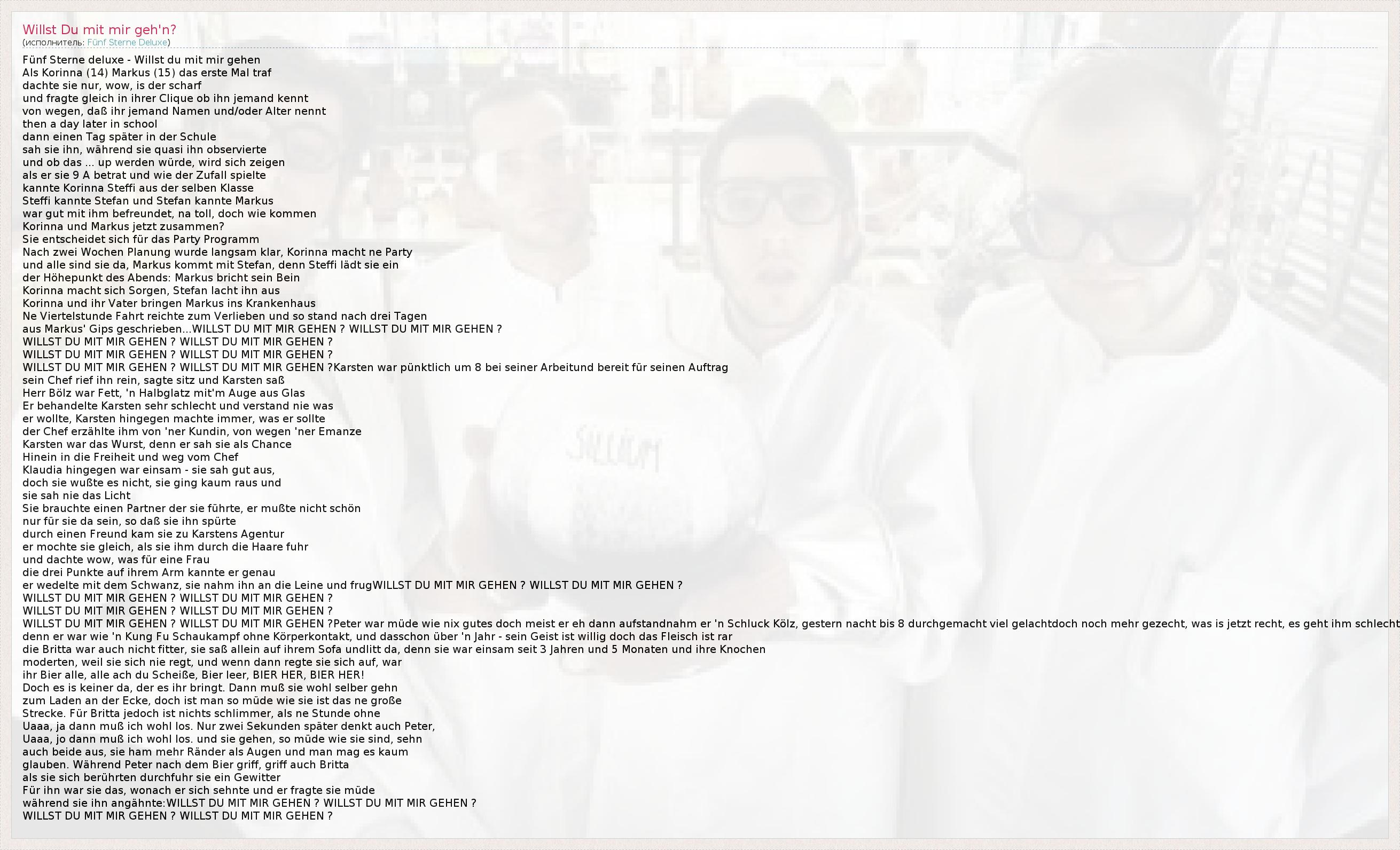 Fünf Sterne deluxe - Willst du mit mir gehen Als Korinna (14) Markus (15) das erste Mal traf dachte sie nur, wow, is der scharf und fragte gleich in ihrer Clique ob ihn jemand kennt von wegen, daß ihr jemand Namen und/oder Alter nennt then a day later in school dann einen Tag später in der Schule sah sie ihn, während sie quasi ihn observierte und ob das ... up werden würde, wird sich zeigen als er sie 9 A betrat und wie der Zufall spielte kannte Korinna Steffi aus der selben Klasse Steffi kannte Stefan und Stefan kannte Markus war gut mit ihm befreundet, na toll, doch wie kommen Korinna und Markus jetzt zusammen? Sie entscheidet sich für das Party Programm Nach zwei Wochen Planung wurde langsam klar, Korinna macht ne Party und alle sind sie da, Markus kommt mit Stefan, denn Steffi lädt sie ein der Höhepunkt des Abends: Markus bricht sein Bein Korinna macht sich Sorgen, Stefan lacht ihn aus Korinna und ihr Vater bringen Markus ins Krankenhaus Ne Viertelstunde Fahrt reichte zum Verlieben und so stand nach drei Tagen aus Markus' Gips geschrieben...WILLST DU MIT MIR GEHEN ? WILLST DU MIT MIR GEHEN ? WILLST DU MIT MIR GEHEN ? WILLST DU MIT MIR GEHEN ? WILLST DU MIT MIR GEHEN ? WILLST DU MIT MIR GEHEN ? WILLST DU MIT MIR GEHEN ? WILLST DU MIT MIR GEHEN ?Karsten war pünktlich um 8 bei seiner Arbeitund bereit für seinen Auftrag sein Chef rief ihn rein, sagte sitz und Karsten saß Herr Bölz war Fett, 'n Halbglatz mit'm Auge aus Glas Er behandelte Karsten sehr schlecht und verstand nie was er wollte, Karsten hingegen machte immer, was er sollte der Chef erzählte ihm von 'ner Kundin, von wegen 'ner Emanze Karsten war das Wurst, denn er sah sie als Chance Hinein in die Freiheit und weg vom Chef Klaudia hingegen war einsam - sie sah gut aus, doch sie wußte es nicht, sie ging kaum raus und sie sah nie das Licht Sie brauchte einen Partner der sie führte, er mußte nicht schön nur für sie da sein, so daß sie ihn spürte durch einen Freund kam sie zu Karstens Agentur er mochte sie gleich, als sie ihm durch die Haare fuhr und dachte wow, was für eine Frau die drei Punkte auf ihrem Arm kannte er genau er wedelte mit dem Schwanz, sie nahm ihn an die Leine und frugWILLST DU MIT MIR GEHEN ? WILLST DU MIT MIR GEHEN ? WILLST DU MIT MIR GEHEN ? WILLST DU MIT MIR GEHEN ? WILLST DU MIT MIR GEHEN ? WILLST DU MIT MIR GEHEN ? WILLST DU MIT MIR GEHEN ? WILLST DU MIT MIR GEHEN ?Peter war müde wie nix gutes doch meist er eh dann aufstandnahm er 'n Schluck Kölz, gestern nacht bis 8 durchgemacht viel gelachtdoch noch mehr gezecht, was is jetzt recht, es geht ihm schlecht denn er war wie 'n Kung Fu Schaukampf ohne Körperkontakt, und dasschon über 'n Jahr - sein Geist ist willig doch das Fleisch ist rar die Britta war auch nicht fitter, sie saß allein auf ihrem Sofa undlitt da, denn sie war einsam seit 3 Jahren und 5 Monaten und ihre Knochen moderten, weil sie sich nie regt, und wenn dann regte sie sich auf, war ihr Bier alle, alle ach du Scheiße, Bier leer, BIER HER, BIER HER! Doch es is keiner da, der es ihr bringt. Dann muß sie wohl selber gehn zum Laden an der Ecke, doch ist man so müde wie sie ist das ne große Strecke. Für Britta jedoch ist nichts schlimmer, als ne Stunde ohne Uaaa, ja dann muß ich wohl los. Nur zwei Sekunden später denkt auch Peter, Uaaa, jo dann muß ich wohl los. und sie gehen, so müde wie sie sind, sehn auch beide aus, sie ham mehr Ränder als Augen und man mag es kaum glauben. Während Peter nach dem Bier griff, griff auch Britta als sie sich berührten durchfuhr sie ein Gewitter Für ihn war sie das, wonach er sich sehnte und er fragte sie müde während sie ihn angähnte:WILLST DU MIT MIR GEHEN ? WILLST DU MIT MIR GEHEN ? WILLST DU MIT MIR GEHEN ? WILLST DU MIT MIR GEHEN ?