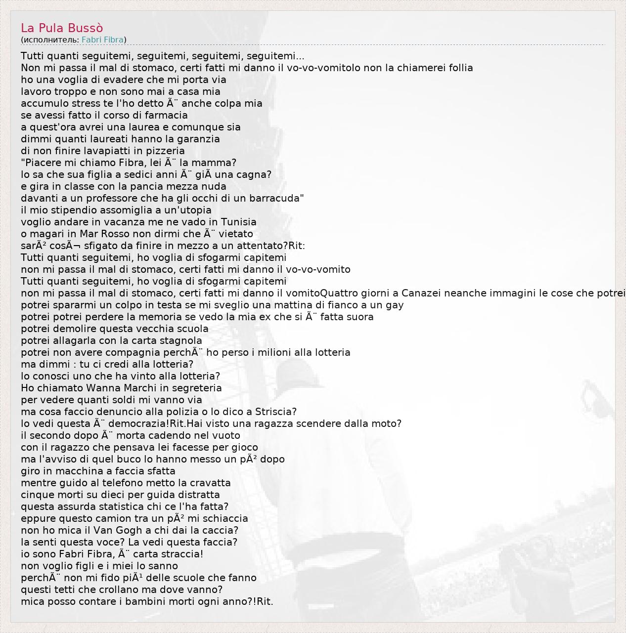 Это интересно:Фабрицио Тардуччи (Fabrizio Tarducci) – итальянский rapper, более известный как Fabri Fibra (Сенигаллия, 17 октября 1976). Фабри – старший брат другого итальянского rapper’а Nesly Rice.Начало пути: подростком начал интересоваться музыкой: первую запись сделал в 17 лет. Отличительная черта Фабри – это изменение тональности его голоса (особенно это слышно в альбоме «Mr. Simpatia») как в студийных записях, так и в... продолжение