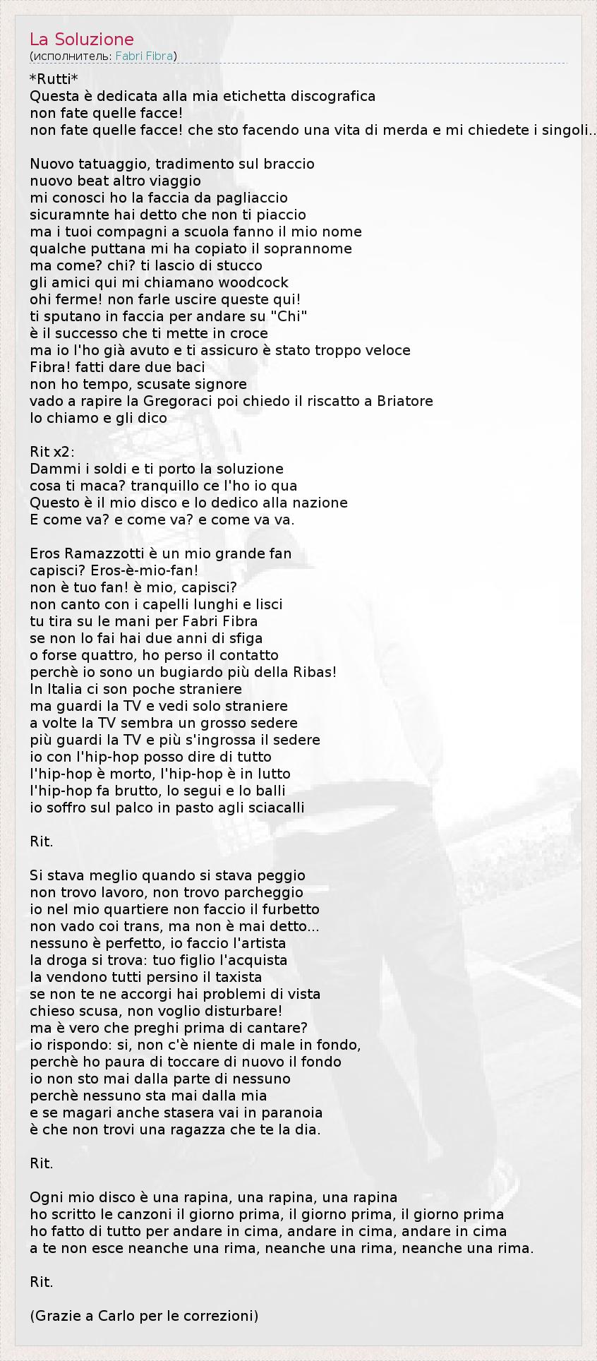 Это интересно:Фабрицио Тардуччи (Fabrizio Tarducci) – итальянский rapper, более известный как Fabri Fibra (Сенигаллия, 17 октября 1976). Фабри – старший брат другого итальянского rapper’а Nesly Rice.Начало пути: подростком начал интересоваться музыкой: первую запись сделал в 17 лет. Отличительная черта Фабри – это изменение тональности его голоса (особенно это слышно в альбоме «Mr. Simpatia») как в студийных записях, так и в... продолжение