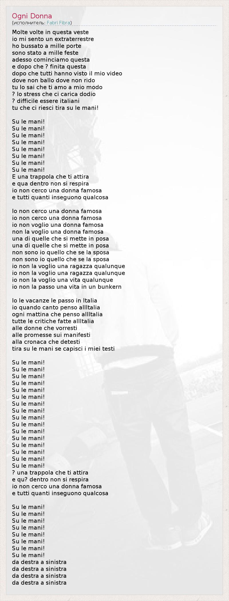 Это интересно:Фабрицио Тардуччи (Fabrizio Tarducci) – итальянский rapper, более известный как Fabri Fibra (Сенигаллия, 17 октября 1976). Фабри – старший брат другого итальянского rapper’а Nesly Rice.Начало пути: подростком начал интересоваться музыкой: первую запись сделал в 17 лет. Отличительная черта Фабри – это изменение тональности его голоса (особенно это слышно в альбоме «Mr. Simpatia») как в студийных записях, так и в... продолжение