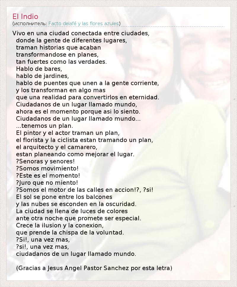 Vivo en una ciudad conectada entre ciudades, donde la gente de diferentes lugares, traman historias que acaban transformandose en planes, tan fuertes como las verdades. Hablo de bares, hablo de jardines, hablo de puentes que unen a la gente corriente, y los transforman en algo mas que una realidad para convertirlos en eternidad. Ciudadanos de un lugar llamado mundo, ahora es el momento porque asi lo siento. Ciudadanos de un lugar llamado mundo... ...tenemos un plan. El pintor y el actor traman un plan, el florista y la ciclista estan tramando un plan, el arquitecto y el camarero, estan planeando como mejorar el lugar. ?Senoras y senores! ?Somos movimiento! ?Este es el momento! ?Juro que no miento! ?Somos el motor de las calles en accion!?, ?si! El sol se pone entre los balcones y las nubes se esconden en la oscuridad. La ciudad se llena de luces de colores ante otra noche que promete ser especial. Crece la ilusion y la conexion, que prende la chispa de la voluntad. ?Si!, una vez mas, ?si!, una vez mas, ciudadanos de un lugar llamado mundo. (Gracias a Jesus Angel Pastor Sanchez por esta letra)