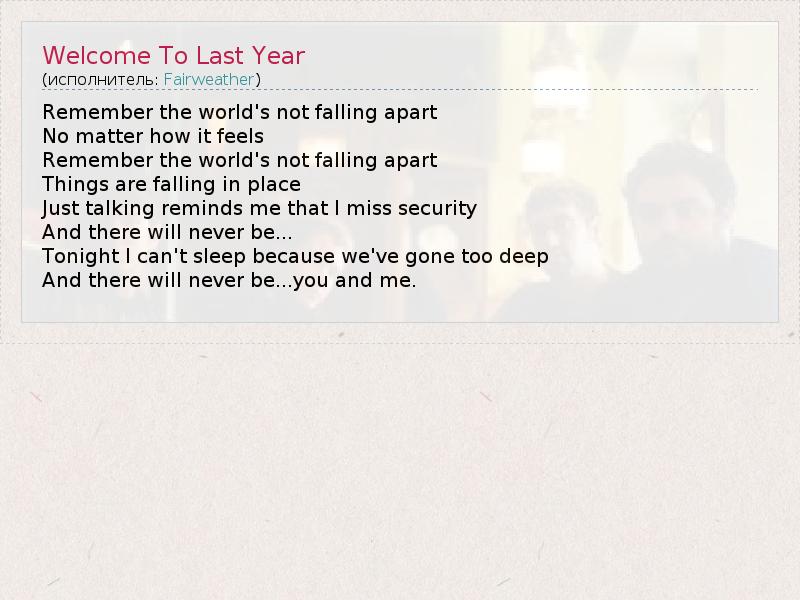А как ты думаешь, о чем песня "Welcome To Last Year" ?
