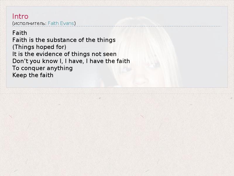 Это интересно:Faith Evans родилась в 1973 году во Флориде, но переехала в Newark (New Jersey) где и росла, живя вместе с матерью, бабушкой и дедушкой. По легенде, она уже в два года пела в церкви. Затем она пела в школе, пока училась, а в последствии даже выиграла по конкурсу обучение в Fordham University с оплачиваемой стипендией.Отучившись год, Faith Evans бросила колледж чтобы проверить, можно ли зарабатывать с помощью собственного... продолжение