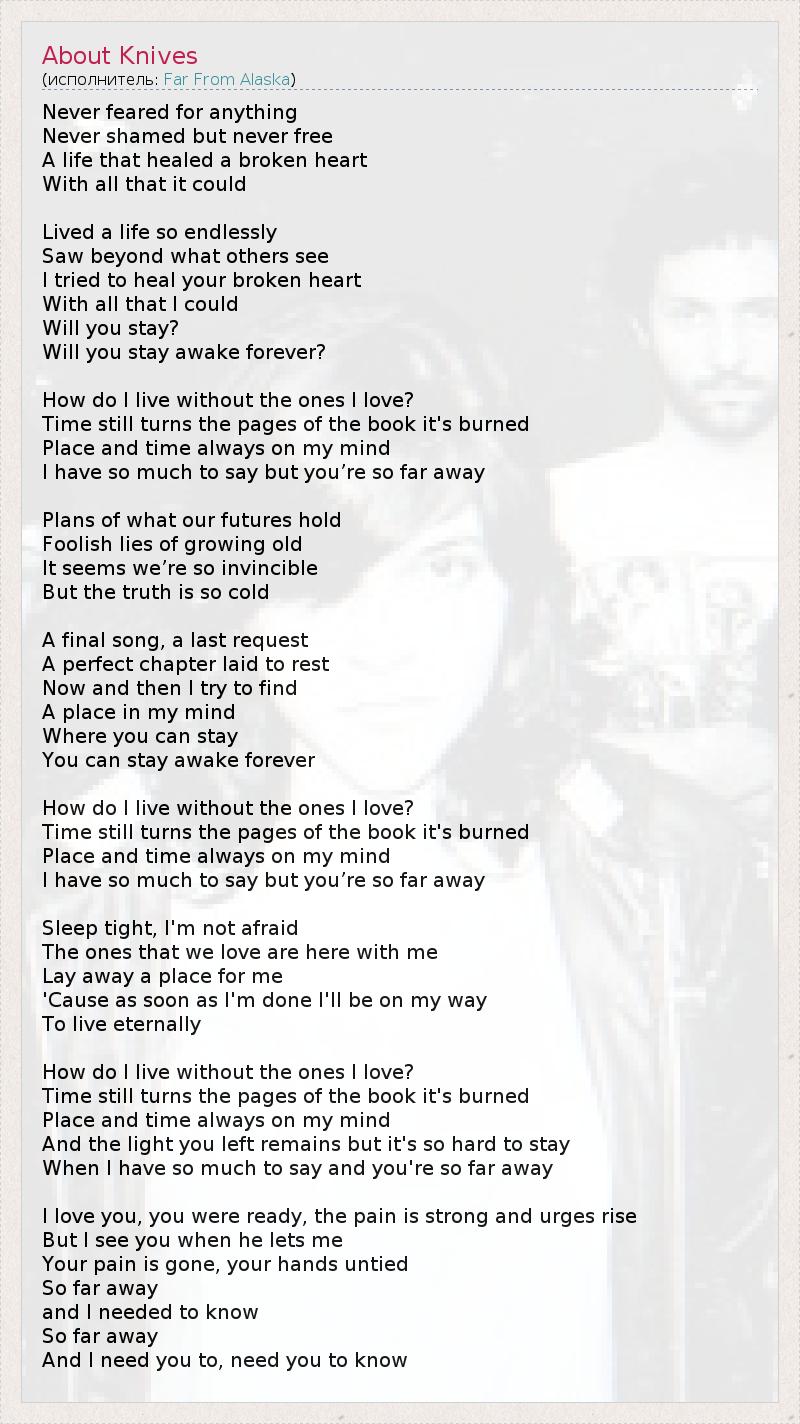Никогда и ничего не боялся, Никогда не стыдился, но и не был свободным. Жизнь залечила разбитое сердце, Как только могла... Проживал такую бесконечную жизнь, Видел вещи глубже, чем другие. Я пытался излечить твоё разбитое сердце, Как только мог. Останешься ли ты? Останешься ли ты живым навсегда? Как я живу без тех, кого люблю? Время по-прежнему перелистывает страницы сожжённой им книги. Время и место всегда в моих мыслях, Мне нужно сказать так многое, но ты так далеко... Планы о том, что таит наше будущее – Глупый самообман при взрослении. Кажется, что мы так неуязвимы, Но правда очень холодна. Финальная песня, последний вопрос, Прекрасная глава завершена. Порой я пытаюсь отыскать Местечко в мыслях, Где ты сможешь остаться, Сможешь остаться живым навсегда. Как я живу без тех, кого люблю? Время по-прежнему перелистывает страницы сожжённой им книги. Время и место всегда в моих мыслях, Мне нужно сказать так многое, но ты так далеко... Спокойной ночи, я не боюсь, Те, кого я люблю, всегда со мной. Оставьте место и для меня, Потому что как только я закончу, я отправлюсь В путь к вечной жизни. Как я живу без тех, кого люблю? Время по-прежнему перелистывает страницы сожжённой им книги. Время и место всегда в моих мыслях, И свет, оставленный тобой, горит, но очень сложно не уйти, Когда мне нужно так многое тебе сказать, а ты так далеко... Я люблю тебя, ты был готов, боль сильна и толчки всё чаще, Но я вижу тебя, когда Он позволяет мне – Твоя боль ушла, руки не связаны, Так далеко... И мне нужно было знать Так далеко... И мне нужно, нужно, чтобы ты знал.