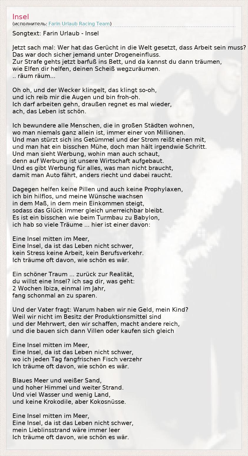 Songtext: Farin Urlaub - Insel Jetzt sach mal: Wer hat das Gerücht in die Welt gesetzt, dass Arbeit sein muss? Das war doch sicher jemand unter Drogeneinfluss. Zur Strafe gehts jetzt barfuß ins Bett, und da kannst du dann träumen, wie Elfen dir helfen, deinen Scheiß wegzuräumen. .. räum räum... Oh oh, und der Wecker klingelt, das klingt so-oh, und ich reib mir die Augen und bin froh-oh. Ich darf arbeiten gehn, draußen regnet es mal wieder, ach, das Leben ist schön. Ich bewundere alle Menschen, die in großen Städten wohnen, wo man niemals ganz allein ist, immer einer von Millionen. Und man stürzt sich ins Getümmel und der Strom reißt einen mit, und man hat ein bisschen Mühe, doch man hält irgendwie Schritt. Und man sieht Werbung, wohin man auch schaut, denn auf Werbung ist unsere Wirtschaft aufgebaut. Und es gibt Werbung für alles, was man nicht braucht, damit man Auto fährt, anders riecht und dabei raucht. Dagegen helfen keine Pillen und auch keine Prophylaxen, ich bin hilflos, und meine Wünsche wachsen in dem Maß, in dem mein Einkommen steigt, sodass das Glück immer gleich unerreichbar bleibt. Es ist ein bisschen wie beim Turmbau zu Babylon, ich hab so viele Träume ... hier ist einer davon: Eine Insel mitten im Meer, Eine Insel, da ist das Leben nicht schwer, kein Stress keine Arbeit, kein Berufsverkehr. Ich träume oft davon, wie schön es wär. Ein schöner Traum ... zurück zur Realität, du willst eine Insel? ich sag dir, was geht: 2 Wochen Ibiza, einmal im Jahr, fang schonmal an zu sparen. Und der Vater fragt: Warum haben wir nie Geld, mein Kind? Weil wir nicht im Besitz der Produktionsmittel sind und der Mehrwert, den wir schaffen, macht andere reich, und die bauen sich dann Villen oder kaufen sich gleich Eine Insel mitten im Meer, Eine Insel, da ist das Leben nicht schwer, wo ich jeden Tag fangfrischen Fisch verzehr Ich träume oft davon, wie schön es wär. Blaues Meer und weißer Sand, und hoher Himmel und weiter Strand. Und viel Wasser und wenig Land, und keine Krokodile, aber Kokosnüsse. Eine Insel mitten im Meer, Eine Insel, da ist das Leben nicht schwer, mein Lieblinsstrand wäre immer leer Ich träume oft davon, wie schön es wär.