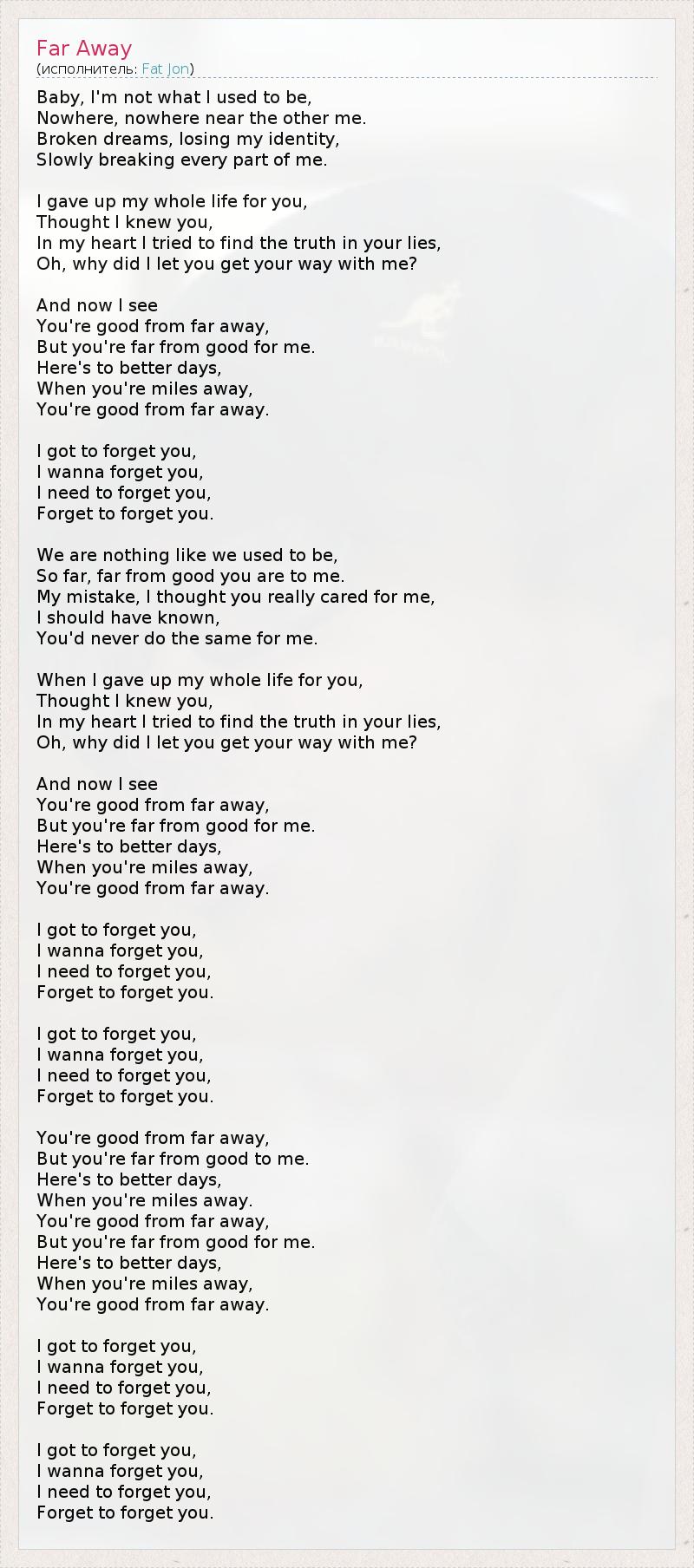 Baby, I'm not what I used to be, Nowhere, nowhere near the other me. Broken dreams, losing my identity, Slowly breaking every part of me. I gave up my whole life for you, Thought I knew you, In my heart I tried to find the truth in your lies, Oh, why did I let you get your way with me? And now I see You're good from far away, But you're far from good for me. Here's to better days, When you're miles away, You're good from far away. I got to forget you, I wanna forget you, I need to forget you, Forget to forget you. We are nothing like we used to be, So far, far from good you are to me. My mistake, I thought you really cared for me, I should have known, You'd never do the same for me. When I gave up my whole life for you, Thought I knew you, In my heart I tried to find the truth in your lies, Oh, why did I let you get your way with me? And now I see You're good from far away, But you're far from good for me. Here's to better days, When you're miles away, You're good from far away. I got to forget you, I wanna forget you, I need to forget you, Forget to forget you. I got to forget you, I wanna forget you, I need to forget you, Forget to forget you. You're good from far away, But you're far from good to me. Here's to better days, When you're miles away. You're good from far away, But you're far from good for me. Here's to better days, When you're miles away, You're good from far away. I got to forget you, I wanna forget you, I need to forget you, Forget to forget you. I got to forget you, I wanna forget you, I need to forget you, Forget to forget you.
