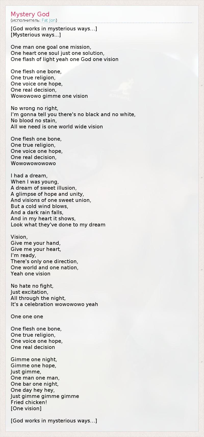 [Пути Господни неисповедимы...] [Неисповедимы...] Один человек, одна цель, одна миссия, Одно сердце, одна душа, один выход, Одна вспышка светa, один Бог, одно видение. Одна плоть, одна кость, Одна истинная религия, Один голос, одна надежда, Одно правильное решение, Оу-оу-оу-оу, дай мне одно видение. Нет неправых, нет правых, Скажу тебе, нет ни черного, ни белого, Нет крови, нет пятен, Всё, что нам нужно, – единое видение мира. Одна плоть, одна кость, Одна истинная религия, Один голос, одна надежда, Одно правильное решение, Оу-оу-оу-оу-оу-оу Мне приснился сон, Когда я был совсем юным, Сон сладкой иллюзии, Мелькание надежды и единства И видение одного прекрасного союза... Но подул холодный ветер, И началась буря, И я чувствую это всем сердцем. Посмотри, что они сделали с моей мечтой! Видение, Дай мне свою руку, Дай мне своё сердце – Я готов. Есть только один путь – Один мир, одна нация, Одно видение. Нет ненависти, нет войн, Только возбуждение, Всю ночь, Это торжество, оу-оу-оу-оу-да! Одно, одно, одно... Одна плоть, одна кость, Одна истинная религия, Один голос, одна надежда, Одно правильное решение. Дай мне одну ночь, Дай мне одну надежду, Только дай – Одного человека, одного человека, Один бар, одну ночь, Один день, эй, эй! Только дай, дай, дай Жареную курицу! [Одно видение] [Пути Господни неисповедимы…]