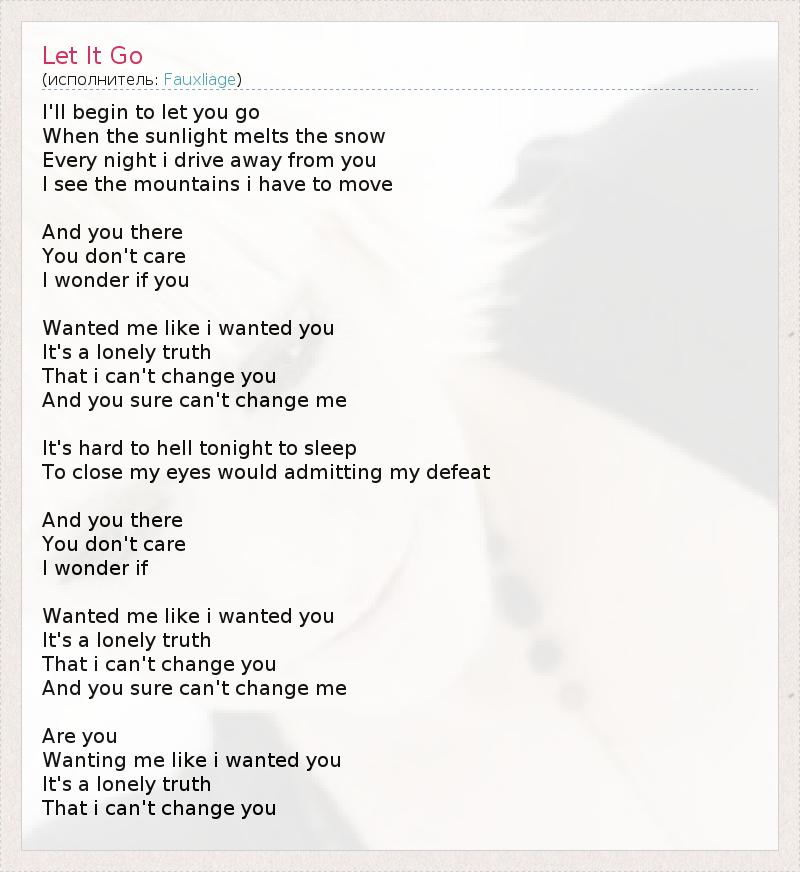 I'll begin to let you go When the sunlight melts the snow Every night i drive away from you I see the mountains i have to move And you there You don't care I wonder if you Wanted me like i wanted you It's a lonely truth That i can't change you And you sure can't change me It's hard to hell tonight to sleep To close my eyes would admitting my defeat And you there You don't care I wonder if Wanted me like i wanted you It's a lonely truth That i can't change you And you sure can't change me Are you Wanting me like i wanted you It's a lonely truth That i can't change you