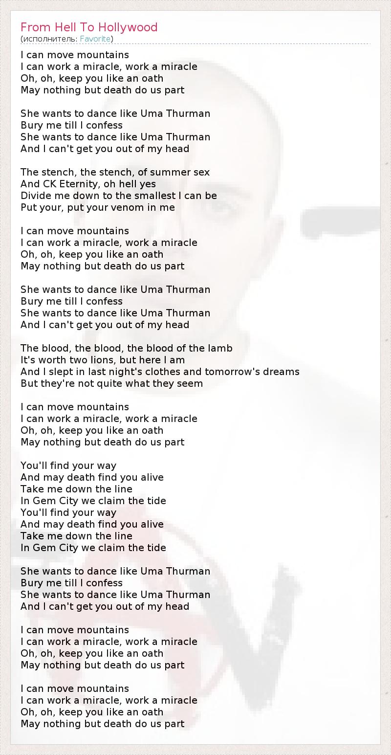 Я могу сдвинуть горы, Я могу сотворить чудо, сотворить чудо: О, о, быть верным тебе, как клятве. И пусть ничто, кроме смерти, не разлучит нас... Она хочет танцевать, как Ума Турман, Зарывать меня в землю, пока я не сознаюсь. Она хочет танцевать, как Ума Турман, И я не могу выкинуть тебя из головы. Зловоние, смрад летнего секса И CK Eternity, 1 о, черт возьми, да! Раздели меня до наименьшего возможного частного, 2 Введи свой, введи свой яд в меня. Я могу сдвинуть горы, Я могу сотворить чудо, сотворить чудо: О, о, быть верным тебе, как клятве. И пусть ничто, кроме смерти, не разлучит нас... Она хочет танцевать, как Ума Турман, Зарывать меня в землю, пока я не сознаюсь. Она хочет танцевать, как Ума Турман, И я не могу выкинуть тебя из головы. Кровь, кровь, кровь ягненка, Она стоит двух львов, но вот он я. Я спал во вчерашней одежде и в завтрашних мечтах, Но они не совсем то, чем кажутся. Я могу сдвинуть горы, Я могу сотворить чудо, сотворить чудо: О, о, быть верным тебе, как клятве. И пусть ничто, кроме смерти, не разлучит нас... Ты найдешь свой путь, И пусть смерть застанет тебя живой. Отведи меня в конец пути, В Городе Самоцветов мы покорим волну. Ты найдешь свой путь, И пусть смерть застанет тебя живой. Отведи меня в конец пути, В Городе Самоцветов мы покорим волну. Она хочет танцевать, как Ума Турман, Зарывать меня в землю, пока я не сознаюсь. Она хочет танцевать, как Ума Турман, И я не могу выкинуть тебя из головы. Я могу сдвинуть горы, Я могу сотворить чудо, сотворить чудо: О, о, быть верным тебе, как клятве. И пусть ничто, кроме смерти, не разлучит нас... Я могу сдвинуть горы, Я могу сотворить чудо, сотворить чудо: О, о, быть верным тебе, как клятве. И пусть ничто, кроме смерти, не разлучит нас... 1 - Eternity - название аромата марки Calvin Klein 2 - имеется в виду один из членов математического уравнения с делением: Делимое / Делитель = Частное