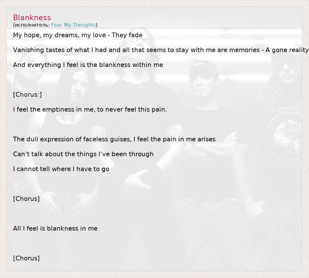 My hope, my dreams, my love - They fade Vanishing tastes of what I had and all that seems to stay with me are memories - A gone reality And everything I feel is the blankness within me [Chorus:] I feel the emptiness in me, to never feel this pain. The dull expression of faceless guises, I feel the pain in me arises Can't talk about the things I've been through I cannot tell where I have to go [Chorus] All I feel is blankness in me [Chorus]