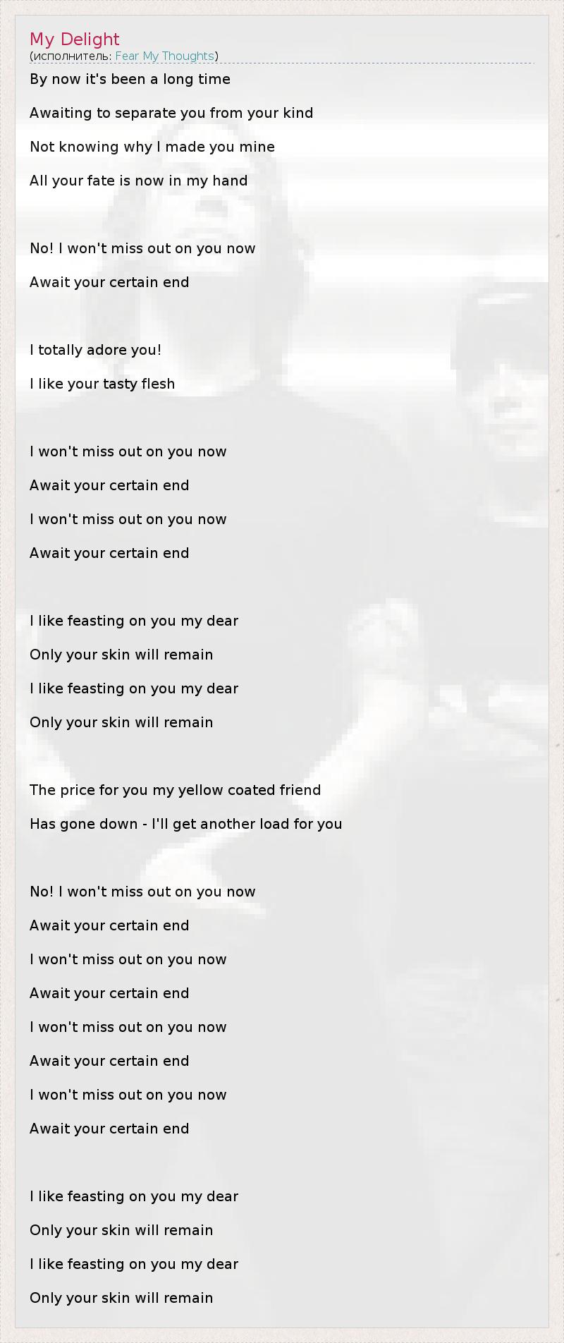 By now it's been a long time Awaiting to separate you from your kind Not knowing why I made you mine All your fate is now in my hand No! I won't miss out on you now Await your certain end I totally adore you! I like your tasty flesh I won't miss out on you now Await your certain end I won't miss out on you now Await your certain end I like feasting on you my dear Only your skin will remain I like feasting on you my dear Only your skin will remain The price for you my yellow coated friend Has gone down - I'll get another load for you No! I won't miss out on you now Await your certain end I won't miss out on you now Await your certain end I won't miss out on you now Await your certain end I won't miss out on you now Await your certain end I like feasting on you my dear Only your skin will remain I like feasting on you my dear Only your skin will remain
