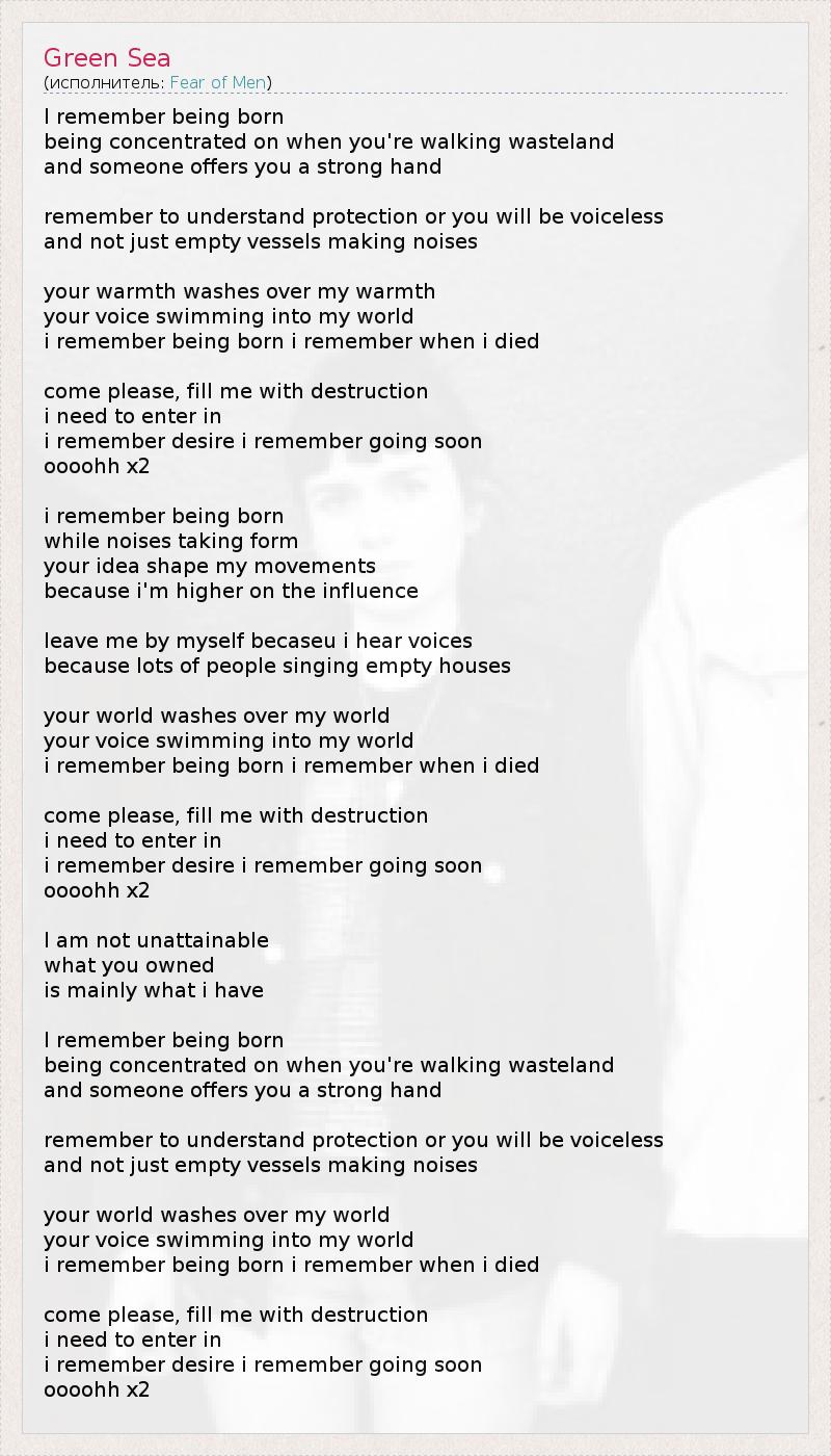 I remember being born being concentrated on when you're walking wasteland and someone offers you a strong hand remember to understand protection or you will be voiceless and not just empty vessels making noises your warmth washes over my warmth your voice swimming into my world i remember being born i remember when i died come please, fill me with destruction i need to enter in i remember desire i remember going soon oooohh x2 i remember being born while noises taking form your idea shape my movements because i'm higher on the influence leave me by myself becaseu i hear voices because lots of people singing empty houses your world washes over my world your voice swimming into my world i remember being born i remember when i died come please, fill me with destruction i need to enter in i remember desire i remember going soon oooohh x2 I am not unattainable what you owned is mainly what i have I remember being born being concentrated on when you're walking wasteland and someone offers you a strong hand remember to understand protection or you will be voiceless and not just empty vessels making noises your world washes over my world your voice swimming into my world i remember being born i remember when i died come please, fill me with destruction i need to enter in i remember desire i remember going soon oooohh x2