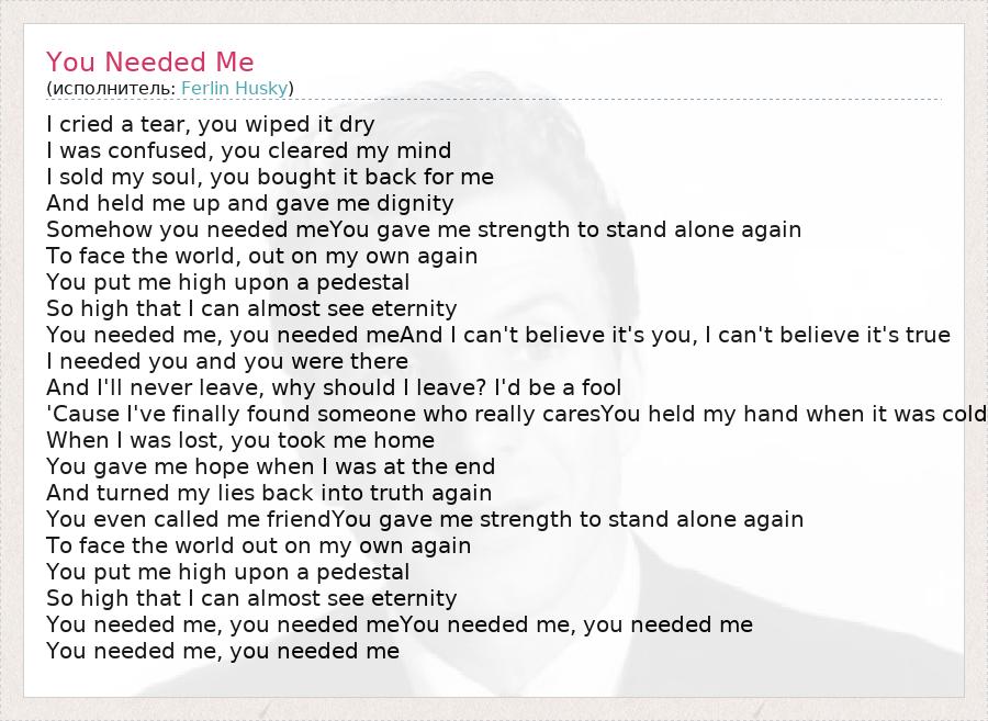 I cried a tear, you wiped it dry I was confused, you cleared my mind I sold my soul, you bought it back for me And held me up and gave me dignity Somehow you needed meYou gave me strength to stand alone again To face the world, out on my own again You put me high upon a pedestal So high that I can almost see eternity You needed me, you needed meAnd I can't believe it's you, I can't believe it's true I needed you and you were there And I'll never leave, why should I leave? I'd be a fool 'Cause I've finally found someone who really caresYou held my hand when it was cold When I was lost, you took me home You gave me hope when I was at the end And turned my lies back into truth again You even called me friendYou gave me strength to stand alone again To face the world out on my own again You put me high upon a pedestal So high that I can almost see eternity You needed me, you needed meYou needed me, you needed me You needed me, you needed me