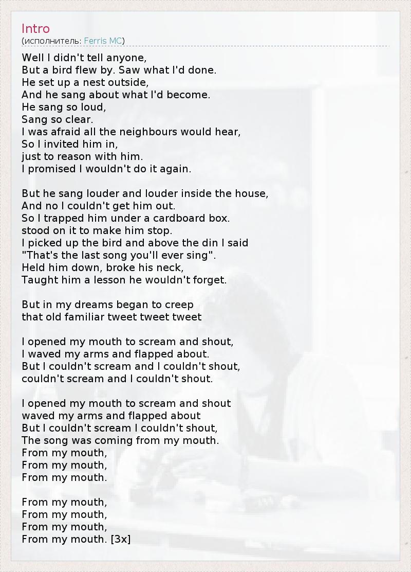 Well I didn't tell anyone, But a bird flew by. Saw what I'd done. He set up a nest outside, And he sang about what I'd become. He sang so loud, Sang so clear. I was afraid all the neighbours would hear, So I invited him in, just to reason with him. I promised I wouldn't do it again. But he sang louder and louder inside the house, And no I couldn't get him out. So I trapped him under a cardboard box. stood on it to make him stop. I picked up the bird and above the din I said "That's the last song you'll ever sing". Held him down, broke his neck, Taught him a lesson he wouldn't forget. But in my dreams began to creep that old familiar tweet tweet tweet I opened my mouth to scream and shout, I waved my arms and flapped about. But I couldn't scream and I couldn't shout, couldn't scream and I couldn't shout. I opened my mouth to scream and shout waved my arms and flapped about But I couldn't scream I couldn't shout, The song was coming from my mouth. From my mouth, From my mouth, From my mouth. From my mouth, From my mouth, From my mouth, From my mouth. [3x]