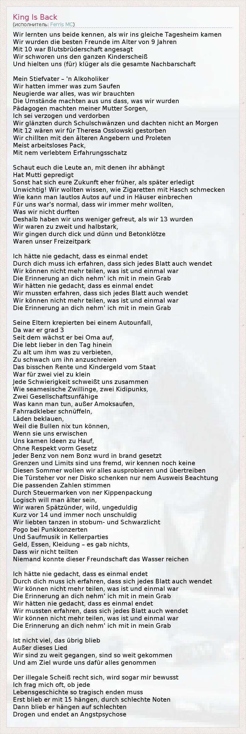Мы познакомились в продлёнке, Были лучшими друзьями с 9 лет. С 10 лет побратались. Мы клялись в своей дружбе всякими дурацкими детскими клятвами И держались друг за друга сильнее, чем все самые дружные соседи. Мой отчим - алкоголик, Поэтому у нас всегда было бухло. Любопытство было единственное, что нами двигало. Обстоятельства сложились так, что мы стали такими. Учителя нервировали мою мать, Я же был непослушный и испорченный. Мы прогуливали школу и не думали о завтрашнем дне. C 12 лет мы тащились по Терезе Оссловски, Тусили со старшими задавалами и хвастунами, Чаще всего с безработными подонками, Которые давно растеряли все свои таланты. Глядя на людей, с которыми зависал, Я начал читать маме мораль, И скорее всего тогда мое будущее стало явным. Неважно! Нам хотелось попробовать гашиш, Узнать, как угнать машину и влезть в дом. Для нас это было нормально, но мы всегда хотели большего, Чем то, на что могли осмелиться. Поэтому мы меньше радовались, когда нам исполнилось 13: Мы были вместе хулиганами, Прошли через огонь, воду и бетонные трубы, И это было нашим развлечением. Я никогда не думал, что это когда-то закончится, Теперь из-за тебя я узнал, что ветер меняется. Мы больше не сможем прожить то, что переживали... Память о тебе заберу я с собой в могилу. Я никогда не думал, что это когда-то закончится, Теперь из-за тебя я узнал, что ветер меняется. Мы больше не сможем прожить то, что переживали... Память о тебе заберу я с собой в могилу. Его родители сдохли в автокатастрофе, Он был тогда в 3 классе. С того времени его растила бабушка, Которая жила одинаково день за днем. Она была слишком старая, чтобы ему что-то запрещать, И слишком слабая, чтобы на него кричать. Льгот и детских пособий государства Никогда ни на что не хватало. Каждая сложность сближала нас еще сильнее, Как сиамских близнецов, двух мелких панков, Двух неблагополучных детей. Что еще оставалось делать, кроме как буйствовать, Нюхать клей от велосипеда, Обворовывать лавки? Ведь полицейские ничего не могли нам сделать, Когда нас ловили. У нас кучами появлялись идеи, Без всякого уважения перед законом. Мы поджигали каждый Benz от Bonz, Границы и рамки для нас не существовали. В то время летом мы хотели все попробовать и исследовать. Вышибалы на дискотеке одаривали нас карточками-ID, Подходящее число на карточке соответствовало Гербовой марке пачки с сигаретами. Конечно, люди хотят казаться старше, Мы были зажигалками, дикими, неуправляемыми, Почти достигшими 14-ти лет, и всё ещё невинными. Нам нравилось танцевать в дыму Пого на панк-концертах, А еще под музыку алкашей в пабах на вечеринках. Деньги, еда, шмотки - не было ничего, В чем мы не принимали участие, Никто не мог разрушить нашу дружбу. Я никогда не думал, что это когда-то закончится, Теперь из-за тебя я узнал, что ветер меняется. Мы больше не сможем прожить то, что переживали... Память о тебе заберу я с собой в могилу. Я никогда не думал, что это когда-то закончится, Теперь из-за тебя я узнал, что ветер меняется. Мы больше не сможем прожить то, что переживали... Память о тебе заберу я с собой в могилу. Не так много осталось от этого, Кроме этой песни. Мы слишком далеко разбежались, по-разному разошлись, И на финише закончили совсем по-разному. Нелегальное дер*мо гребло под себя, тогда я это осознал... Я часто спрашиваю себя, могла ли Какая-то история жизни закончитьс