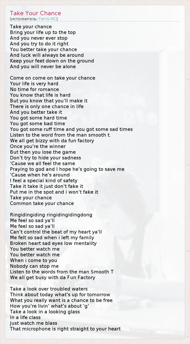 Take your chance Bring your life up to the top And you never ever stop And you try to do it right You better take your chance And luck will always be around Keep your feet down on the ground And you will never be alone Come on come on take your chance Your life is very hard No time for romance You know that life is hard But you know that you'll make it There is only one chance in life And you better take it You got some hard time You got some bad time You got some ruff time and you got some sad times Listen to the word from the man smooth t. We all get bizzy with da fun factory Once you're the winner But then you lose the game Don't try to hide your sadness 'Cause we all feel the same Praying to god and I hope he's going to save me 'Cause when he's around I feel a special kind of safety Take it take it just don't fake it Put me in the spot and i won't fake it Take your chance Common take your chance Ringidingiding ringidingidingdong Me feel so sad ya'll Me feel so sad ya'll Can't control the beat of my heart ya'll Me felt so sad when i left my family Broken heart sad eyes low mentality You better watch me You better watch me When i come to you Nobody can stop me Listen to the words from the man Smooth T We all get busy with da Fun Factory Take a look over troubled waters Think about today what's up for tomorrow What you really want is a chance to be free How you're livin' what's about 'g' Take a look in a looking glass In a life class Just watch me blass That microphone is right straight to your heart