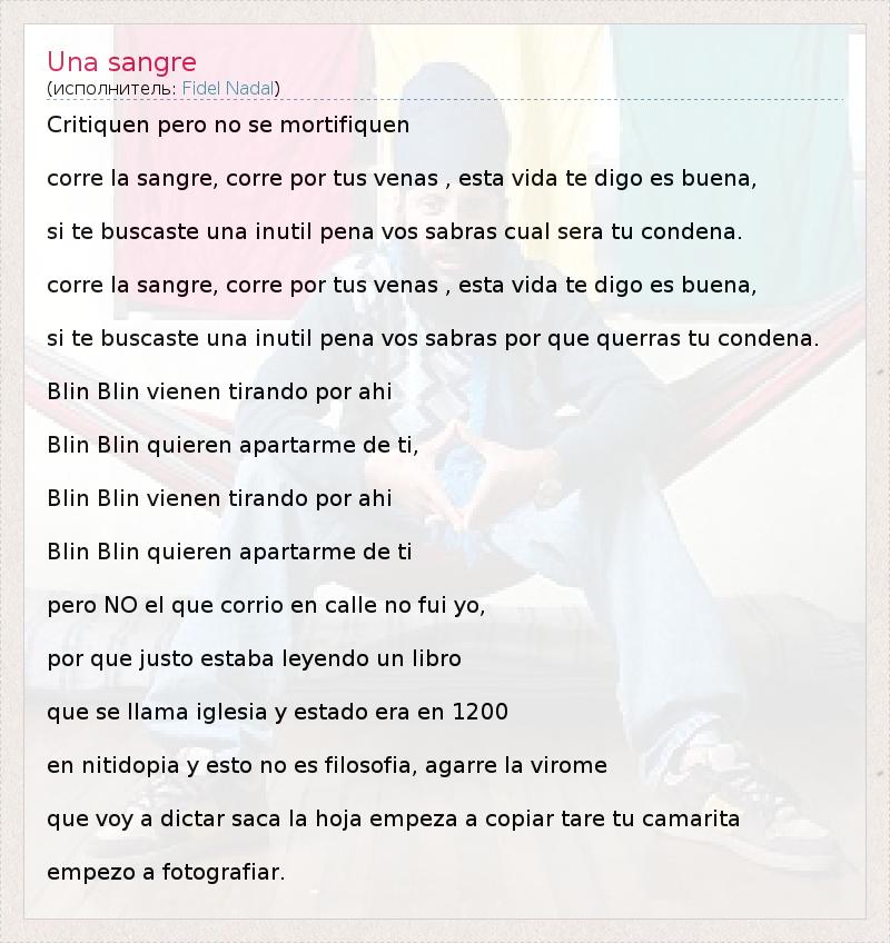 Critiquen pero no se mortifiquen corre la sangre, corre por tus venas , esta vida te digo es buena, si te buscaste una inutil pena vos sabras cual sera tu condena. corre la sangre, corre por tus venas , esta vida te digo es buena, si te buscaste una inutil pena vos sabras por que querras tu condena. Blin Blin vienen tirando por ahi Blin Blin quieren apartarme de ti, Blin Blin vienen tirando por ahi Blin Blin quieren apartarme de ti pero NO el que corrio en calle no fui yo, por que justo estaba leyendo un libro que se llama iglesia y estado era en 1200 en nitidopia y esto no es filosofia, agarre la virome que voy a dictar saca la hoja empeza a copiar tare tu camarita empezo a fotografiar.