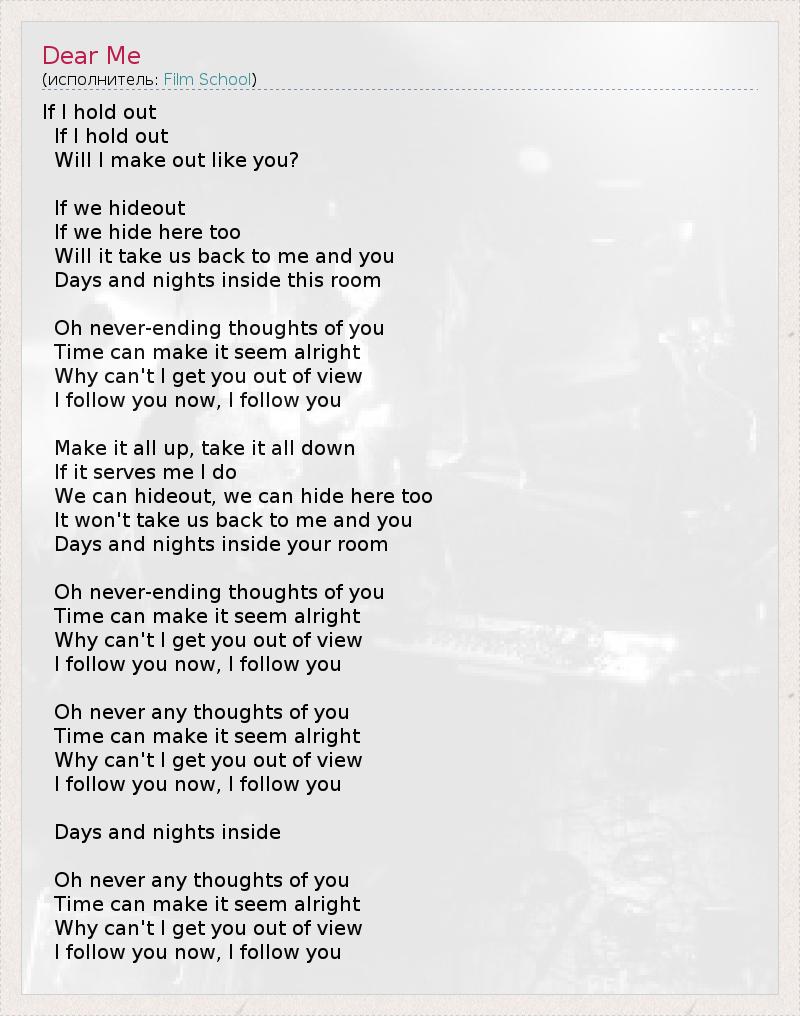 If I hold out If I hold out Will I make out like you? If we hideout If we hide here too Will it take us back to me and you Days and nights inside this room Oh never-ending thoughts of you Time can make it seem alright Why can't I get you out of view I follow you now, I follow you Make it all up, take it all down If it serves me I do We can hideout, we can hide here too It won't take us back to me and you Days and nights inside your room Oh never-ending thoughts of you Time can make it seem alright Why can't I get you out of view I follow you now, I follow you Oh never any thoughts of you Time can make it seem alright Why can't I get you out of view I follow you now, I follow you Days and nights inside Oh never any thoughts of you Time can make it seem alright Why can't I get you out of view I follow you now, I follow you