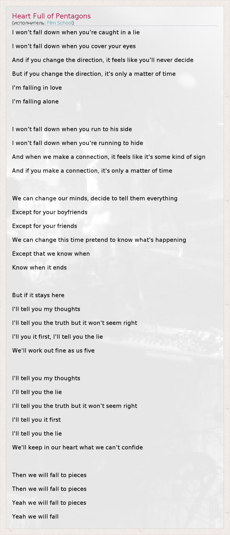 I won't fall down when you're caught in a lie I won't fall down when you cover your eyes And if you change the direction, it feels like you'll never decide But if you change the direction, it's only a matter of time I'm falling in love I'm falling alone I won't fall down when you run to his side I won't fall down when you're running to hide And when we make a connection, it feels like it's some kind of sign And if you make a connection, it's only a matter of time We can change our minds, decide to tell them everything Except for your boyfriends Except for your friends We can change this time pretend to know what's happening Except that we know when Know when it ends But if it stays here I'll tell you my thoughts I'll tell you the truth but it won't seem right I'll you it first, I'll tell you the lie We'll work out fine as us five I'll tell you my thoughts I'll tell you the lie I'll tell you the truth but it won't seem right I'll tell you it first I'll tell you the lie We'll keep in our heart what we can't confide Then we will fall to pieces Then we will fall to pieces Yeah we will fall to pieces Yeah we will fall