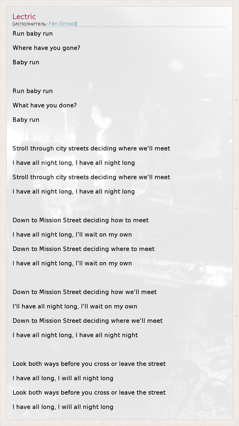 Run baby run Where have you gone? Baby run Run baby run What have you done? Baby run Stroll through city streets deciding where we'll meet I have all night long, I have all night long Stroll through city streets deciding where we'll meet I have all night long, I have all night long Down to Mission Street deciding how to meet I have all night long, I'll wait on my own Down to Mission Street deciding where to meet I have all night long, I'll wait on my own Down to Mission Street deciding how we'll meet I'll have all night long, I'll wait on my own Down to Mission Street deciding where we'll meet I have all night long, I have all night night Look both ways before you cross or leave the street I have all long, I will all night long Look both ways before you cross or leave the street I have all long, I will all night long