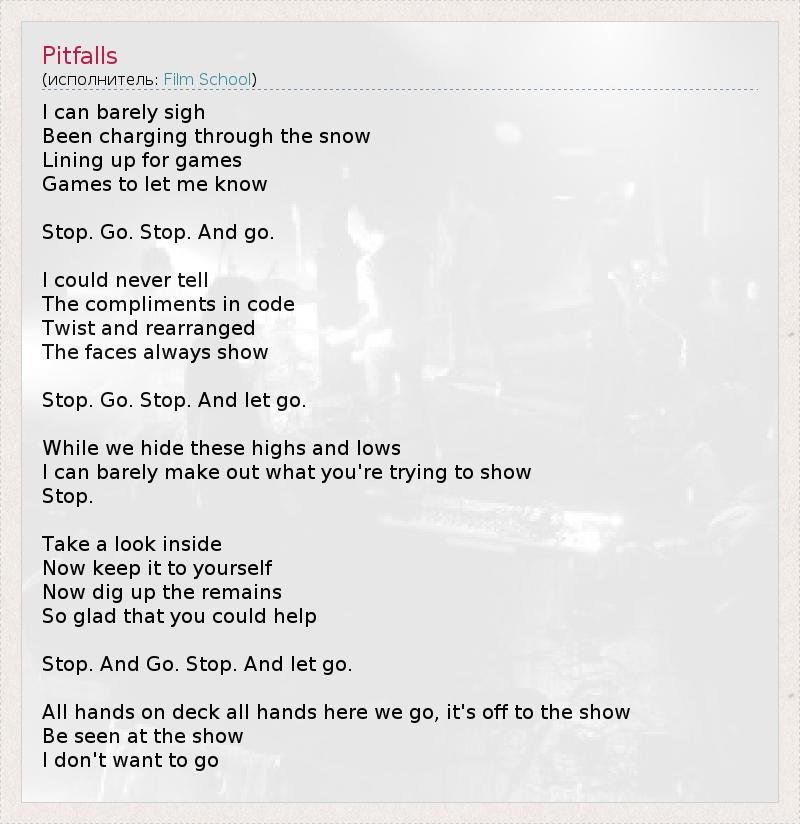 I can barely sigh Been charging through the snow Lining up for games Games to let me know Stop. Go. Stop. And go. I could never tell The compliments in code Twist and rearranged The faces always show Stop. Go. Stop. And let go. While we hide these highs and lows I can barely make out what you're trying to show Stop. Take a look inside Now keep it to yourself Now dig up the remains So glad that you could help Stop. And Go. Stop. And let go. All hands on deck all hands here we go, it's off to the show Be seen at the show I don't want to go