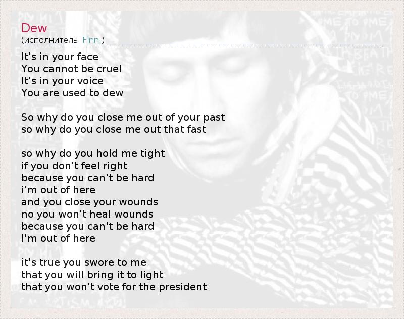 It's in your face You cannot be cruel It's in your voice You are used to dew So why do you close me out of your past so why do you close me out that fast so why do you hold me tight if you don't feel right because you can't be hard i'm out of here and you close your wounds no you won't heal wounds because you can't be hard I'm out of here it's true you swore to me that you will bring it to light that you won't vote for the president