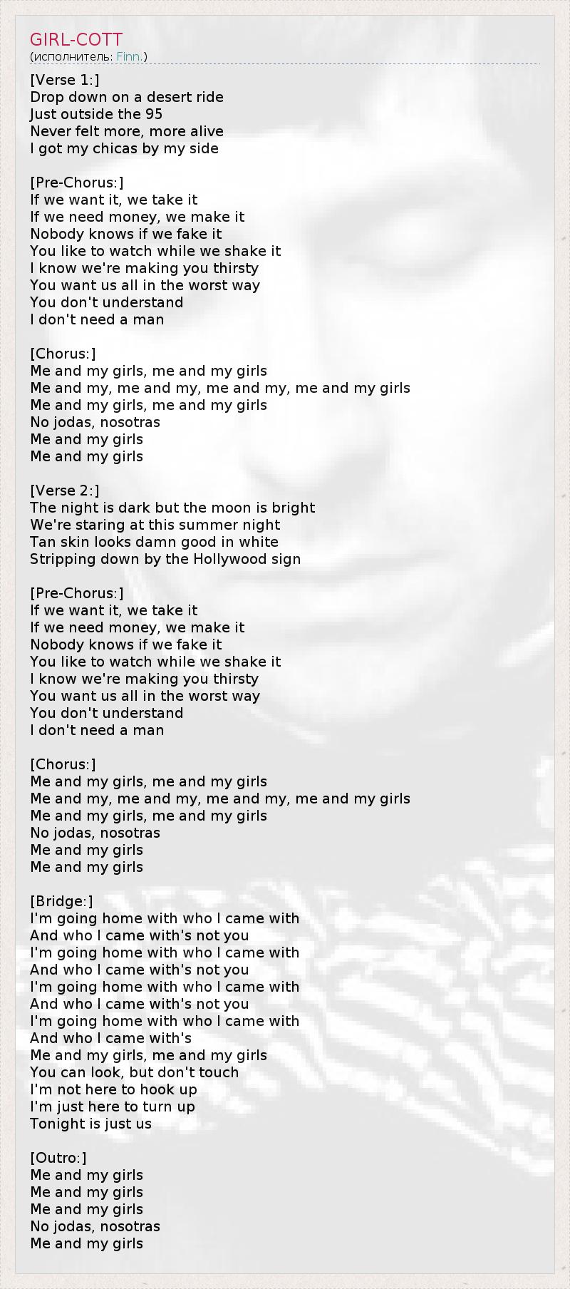 [Куплет 1:] Мы мчимся по пустыне, Вдоль 95-й. 1 Никогда не ощущала себя настолько, настолько живой. Со мной, бок о бок, мои девчонки. [Распевка:] Захотели – взяли. Нужны деньги – достали. И никто не узнает, даже если мы их украли. Вам нравятся наши движения. Я знаю, мы вызываем у вас желание. Вы очень сильно нас хотите. Вы так и не поняли, Мужчины нам не нужны. [Припев:] Я и мои девчонки, я и мои девчонки, Я и мои девчонки, я и мои, я и мои, я и мои девчонки, Я и мои девчонки, я и мои девчонки. Не лезь к нам. Я и мои девчонки. Я и мои девчонки. [Куплет 2:] Ночь темна, лишь ярко светит луна. Мы с изумлением смотрим на летнюю ночь. Смуглая кожа чертовски хорошо сочетается с белым. Мы раздеваемся у знака Голливуда. [Распевка:] Захотели – взяли. Нужны деньги – достали. И никто не узнает, даже если мы их украли. Вам нравятся наши движения. Я знаю, мы вызываем у вас желание. Вы очень сильно нас хотите. Вы так и не поняли, Мужчины нам не нужны. [Припев:] Я и мои девчонки, я и мои девчонки, Я и мои девчонки, я и мои, я и мои, я и мои девчонки, Я и мои девчонки, я и мои девчонки. Не лезь к нам. Я и мои девчонки. Я и мои девчонки. [Переход:] Я возвращаюсь домой, с кем и пришла. А я пришла уж точно не с вами. Я возвращаюсь домой, с кем и пришла. А я пришла уж точно не с вами. Я возвращаюсь домой, с кем и пришла. А я пришла уж точно не с вами. Я возвращаюсь домой, с кем и пришла. А пришла я... Я и мои девчонки, Я и мои девчонки. Можете смотреть, но не трогать. Я здесь позависать, Я здесь, что просто оторваться. Сегодня только мы. [Концовка:] Я и мои девчонки, я и мои девчонки. Я и мои девчонки, я и мои девчонки. Я и мои девчонки, я и мои девчонки. Не лезь к нам. Я и мои девчонки. 1 – автомагистраль в США.