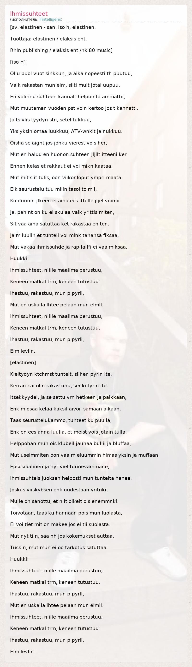 [sv. elastinen - san. iso h, elastinen. Tuottaja: elastinen / elaksis ent. Rhin publishing / elaksis ent./hki80 music] [iso H] Ollu puol vuot sinkkun, ja aika nopeesti th puutuu, Vaik rakastan mun elm, silti mult jotai uupuu. En valinnu suhteen kannalt helpointa ammattii, Mut muutaman vuoden pst voin kertoo jos t kannatti. Ja ts vlis tyydyn stn, setelitukkuu, Yks yksin omaa luukkuu, ATV-wnkit ja nukkuu. Oisha se aight jos jonku vierest vois her, Mut en haluu en huonon suhteen jljilt itteeni ker. Ennen kelas et rakkaut ei voi mikn kaataa, Mut mit siit tulis, oon viikonloput ympri maata. Eik seurustelu tuu milln tasol toimii, Ku duunin jlkeen ei aina ees ittelle jljel voimii. Ja, pahint on ku ei skulaa vaik yrittis miten, Sit vaa aina satuttaa ket rakastaa eniten. Ja m luulin et tunteil voi mink tahansa fiksaa, Mut vakaa ihmissuhde ja rap-laiffi ei vaa miksaa. Huukki: Ihmissuhteet, niille maailma perustuu, Keneen matkal trm, keneen tutustuu. Ihastuu, rakastuu, mun p pyrll, Mut en uskalla lhtee pelaan mun elmll. Ihmissuhteet, niille maailma perustuu, Keneen matkal trm, keneen tutustuu. Ihastuu, rakastuu, mun p pyrll, Elm levlln. [elastinen] Kieltydyn ktchmst tunteit, siihen pyrin ite, Kerran kai olin rakastunu, senki tyrin ite Itsekkyydel, ja se sattu vrn hetkeen ja paikkaan, Enk m osaa kelaa kaksil aivoil samaan aikaan. Taas seurustelukammo, tunteet ku puulla, Enk en ees anna luulla, et meist vois jotain tulla. Helppohan mun ois klubeil jauhaa bullii ja bluffaa, Mut useimmiten oon vaa mieluummin himas yksin ja muffaan. Epsosiaalinen ja nyt viel tunnevammane, Ihmissuhteis juoksen helposti mun tunteita hanee. Joskus viiskybsen ehk uudestaan yritnki, Mulle on sanottu, et niit oikeit ois enemmnki. Toivotaan, taas ku hannaan pois mun luolasta, Ei voi tiet mit on makee jos ei tii suolasta. Mut nyt tiin, saa nh jos kokemukset auttaa, Tuskin, mut mun ei oo tarkotus satuttaa. Huukki: Ihmissuhteet, niille maailma perustuu, Keneen matkal trm, keneen tutustuu. Ihastuu, rakastuu, mun p pyrll, Mut en uskalla lhtee pelaan mun elmll. Ihmissuhteet, niille maailma perustuu, Keneen matkal trm, keneen tutustuu. Ihastuu, rakastuu, mun p pyrll, Elm levlln.