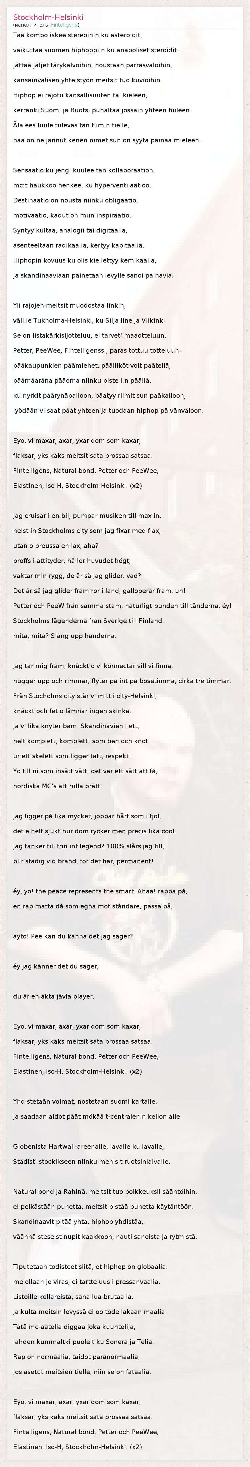 Tää kombo iskee stereoihin ku asteroidit, vaikuttaa suomen hiphoppiin ku anaboliset steroidit. Jättää jäljet tärykalvoihin, noustaan parrasvaloihin, kansainvälisen yhteistyön meitsit tuo kuvioihin. Hiphop ei rajotu kansallisuuten tai kieleen, kerranki Suomi ja Ruotsi puhaltaa jossain yhteen hiileen. Älä ees luule tulevas tän tiimin tielle, nää on ne jannut kenen nimet sun on syytä painaa mieleen. Sensaatio ku jengi kuulee tän kollaboraation, mc:t haukkoo henkee, ku hyperventilaatioo. Destinaatio on nousta niinku obligaatio, motivaatio, kadut on mun inspiraatio. Syntyy kultaa, analogii tai digitaalia, asenteeltaan radikaalia, kertyy kapitaalia. Hiphopin kovuus ku olis kiellettyy kemikaalia, ja skandinaaviaan painetaan levylle sanoi painavia. Yli rajojen meitsit muodostaa linkin, välille Tukholma-Helsinki, ku Silja line ja Viikinki. Se on listakärkisijotteluu, ei tarvet' maaotteluun, Petter, PeeWee, Fintelligenssi, paras tottuu totteluun. pääkaupunkien päämiehet, päälliköt voit päätellä, päämääränä pääoma niinku piste i:n päällä. ku nyrkit päärynäpalloon, päätyy riimit sun pääkalloon, lyödään viisaat päät yhteen ja tuodaan hiphop päivänvaloon. Eyo, vi maxar, axar, yxar dom som kaxar, flaksar, yks kaks meitsit sata prossaa satsaa. Fintelligens, Natural bond, Petter och PeeWee, Elastinen, Iso-H, Stockholm-Helsinki. (x2) Jag cruisar i en bil, pumpar musiken till max in. helst in Stockholms city som jag fixar med flax, utan o preussa en lax, aha? proffs i attityder, håller huvudet högt, vaktar min rygg, de är så jag glider. vad? Det är så jag glider fram ror i land, galloperar fram. uh! Petter och PeeW från samma stam, naturligt bunden till tänderna, éy! Stockholms lägenderna från Sverige till Finland. mitä, mitä? Släng upp händerna. Jag tar mig fram, knäckt o vi konnectar vill vi finna, hugger upp och rimmar, flyter på int på bosetimma, cirka tre timmar. Från Stocholms city står vi mitt i city-Helsinki, knäckt och fet o lämnar ingen skinka. Ja vi lika knyter bam. Skandinavien i ett, helt komplett, komplett! som ben och knot ur ett skelett som ligger tätt, respekt! Yo till ni som insätt vätt, det var ett sätt att få, nordiska MC's att rulla brätt. Jag ligger på lika mycket, jobbar hårt som i fjol, det e helt sjukt hur dom rycker men precis lika cool. Jag tänker till frin int legend? 100% slårs jag till, blir stadig vid brand, för det här, permanent! éy, yo! the peace represents the smart. Ahaa! rappa på, en rap matta då som egna mot ståndare, passa på, ayto! Pee kan du känna det jag säger? éy jag känner det du säger, du är en äkta jävla player. Eyo, vi maxar, axar, yxar dom som kaxar, flaksar, yks kaks meitsit sata prossaa satsaa. Fintelligens, Natural bond, Petter och PeeWee, Elastinen, Iso-H, Stockholm-Helsinki. (x2) Yhdistetään voimat, nostetaan suomi kartalle, ja saadaan aidot päät mökää t-centralenin kellon alle. Globenista Hartwall-areenalle, lavalle ku lavalle, Stadist' stockikseen niinku menisit ruotsinlaivalle. Natural bond ja Rähinä, meitsit tuo poikkeuksii sääntöihin, ei pelkästään puhetta, meitsit pistää puhetta käytäntöön. Skandinaavit pitää yhtä, hiphop yhdistää, väännä steseist nupit kaakkoon, nauti sanoista ja rytmistä. Tiputetaan todisteet siitä, et hiphop on globaalia. me ollaan jo viras, ei tartte uusii pressanvaalia. Listoille kellareista, sanailua brutaalia. Ja kulta meitsin levyssä ei oo todellakaan maalia. Tätä mc-aatelia diggaa joka kuuntelija, lahden kummaltki puolelt ku Sonera ja Telia. Rap on normaalia, taidot paranormaalia, jos asetut meitsien tielle, niin se on fataalia. Eyo, vi maxar, axar, yxar dom som kaxar, flaksar, yks kaks meitsit sata prossaa satsaa. Fintelligens, Natural bond, Petter och PeeWee, Elastinen, Iso-H, Stockholm-Helsinki. (x2)