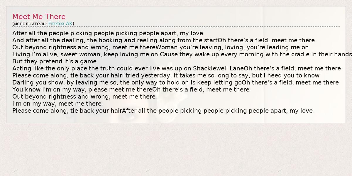 Darling you show, by leaving me so, the only way to hold on is keep letting goOh there's a field, meet me there