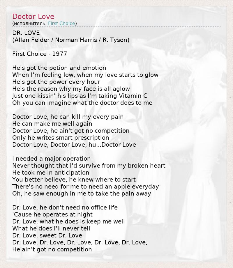 DR. LOVE (Allan Felder / Norman Harris / R. Tyson) First Choice - 1977 He's got the potion and emotion When I'm feeling low, when my love starts to glow He's got the power every hour He's the reason why my face is all aglow Just one kissin' his lips as I'm taking Vitamin C Oh you can imagine what the doctor does to me Doctor Love, he can kill my every pain He can make me well again Doctor Love, he ain't got no competition Only he writes smart prescription Doctor Love, Doctor Love, hu...Doctor Love I needed a major operation Never thought that I'd survive from my broken heart He took me in anticipation You better believe, he knew where to start There's no need for me to need an apple everyday Oh, he saw enough in me to take the pain away Dr. Love, he don't need no office life 'Cause he operates at night Dr. Love, what he does is keep me well What he does I'll never tell Dr. Love, sweet Dr. Love Dr. Love, Dr. Love, Dr. Love, Dr. Love, Dr. Love, He ain't got no competition