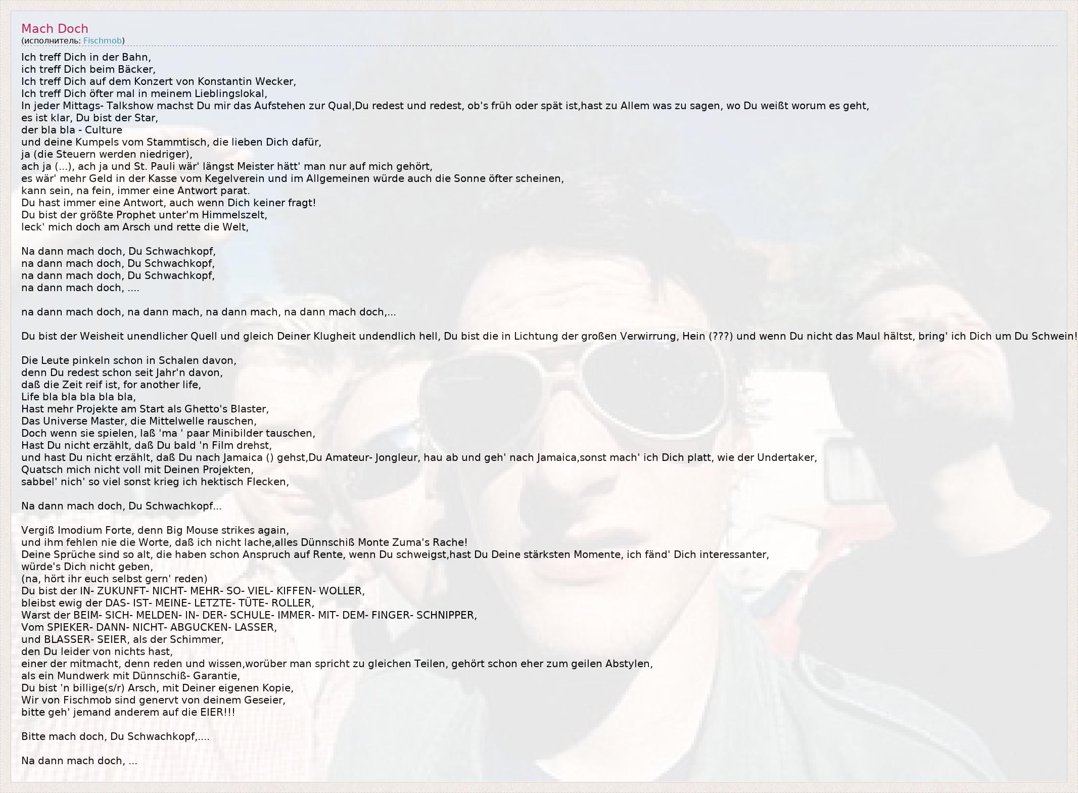 Ich treff Dich in der Bahn, ich treff Dich beim Bäcker, Ich treff Dich auf dem Konzert von Konstantin Wecker, Ich treff Dich öfter mal in meinem Lieblingslokal, In jeder Mittags- Talkshow machst Du mir das Aufstehen zur Qual,Du redest und redest, ob's früh oder spät ist,hast zu Allem was zu sagen, wo Du weißt worum es geht, es ist klar, Du bist der Star, der bla bla - Culture und deine Kumpels vom Stammtisch, die lieben Dich dafür, ja (die Steuern werden niedriger), ach ja (...), ach ja und St. Pauli wär' längst Meister hätt' man nur auf mich gehört, es wär' mehr Geld in der Kasse vom Kegelverein und im Allgemeinen würde auch die Sonne öfter scheinen, kann sein, na fein, immer eine Antwort parat. Du hast immer eine Antwort, auch wenn Dich keiner fragt! Du bist der größte Prophet unter'm Himmelszelt, leck' mich doch am Arsch und rette die Welt, Na dann mach doch, Du Schwachkopf, na dann mach doch, Du Schwachkopf, na dann mach doch, Du Schwachkopf, na dann mach doch, .... na dann mach doch, na dann mach, na dann mach, na dann mach doch,... Du bist der Weisheit unendlicher Quell und gleich Deiner Klugheit undendlich hell, Du bist die in Lichtung der großen Verwirrung, Hein (???) und wenn Du nicht das Maul hältst, bring' ich Dich um Du Schwein! Die Leute pinkeln schon in Schalen davon, denn Du redest schon seit Jahr'n davon, daß die Zeit reif ist, for another life, Life bla bla bla bla bla, Hast mehr Projekte am Start als Ghetto's Blaster, Das Universe Master, die Mittelwelle rauschen, Doch wenn sie spielen, laß 'ma ' paar Minibilder tauschen, Hast Du nicht erzählt, daß Du bald 'n Film drehst, und hast Du nicht erzählt, daß Du nach Jamaica () gehst,Du Amateur- Jongleur, hau ab und geh' nach Jamaica,sonst mach' ich Dich platt, wie der Undertaker, Quatsch mich nicht voll mit Deinen Projekten, sabbel' nich' so viel sonst krieg ich hektisch Flecken, Na dann mach doch, Du Schwachkopf... Vergiß Imodium Forte, denn Big Mouse strikes again, und ihm fehlen nie die Worte, daß ich nicht lache,alles Dünnschiß Monte Zuma's Rache! Deine Sprüche sind so alt, die haben schon Anspruch auf Rente, wenn Du schweigst,hast Du Deine stärksten Momente, ich fänd' Dich interessanter, würde's Dich nicht geben, (na, hört ihr euch selbst gern' reden) Du bist der IN- ZUKUNFT- NICHT- MEHR- SO- VIEL- KIFFEN- WOLLER, bleibst ewig der DAS- IST- MEINE- LETZTE- TÜTE- ROLLER, Warst der BEIM- SICH- MELDEN- IN- DER- SCHULE- IMMER- MIT- DEM- FINGER- SCHNIPPER, Vom SPIEKER- DANN- NICHT- ABGUCKEN- LASSER, und BLASSER- SEIER, als der Schimmer, den Du leider von nichts hast, einer der mitmacht, denn reden und wissen,worüber man spricht zu gleichen Teilen, gehört schon eher zum geilen Abstylen, als ein Mundwerk mit Dünnschiß- Garantie, Du bist 'n billige(s/r) Arsch, mit Deiner eigenen Kopie, Wir von Fischmob sind genervt von deinem Geseier, bitte geh' jemand anderem auf die EIER!!! Bitte mach doch, Du Schwachkopf,.... Na dann mach doch, ...