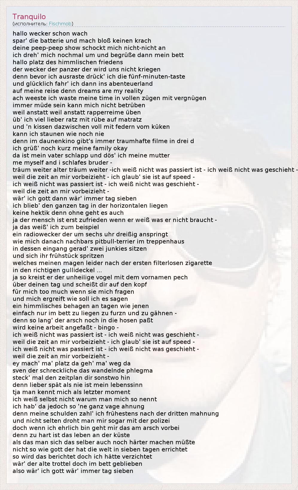 hallo wecker schon wach spar' die batterie und mach bloß keinen krach deine peep-peep show schockt mich nicht-nicht an ich dreh' mich nochmal um und begrüße dann mein bett hallo platz des himmlischen friedens der wecker der panzer der wird uns nicht kriegen denn bevor ich ausraste drück' ich die fünf-minuten-taste und glücklich fahr' ich dann ins abenteuerland auf meine reise denn dreams are my reality ach weeste ich waste meine time in vollen zügen mit vergnügen immer müde sein kann mich nicht betrüben weil anstatt weil anstatt rapperreime üben üb' ich viel lieber ratz mit rübe auf matratz und 'n kissen dazwischen voll mit federn vom küken kann ich staunen wie noch nie denn im daunenkino gibt's immer traumhafte filme in drei d ich grüß' noch kurz meine family okay da ist mein vater schlapp und dös' ich meine mutter me myself and i schlafes bruder - träum weiter alter träum weiter -ich weiß nicht was passiert ist - ich weiß nicht was geschieht - weil die zeit an mir vorbeizieht - ich glaub' sie ist auf speed - ich weiß nicht was passiert ist - ich weiß nicht was geschieht - weil die zeit an mir vorbeizieht - wär' ich gott dann wär' immer tag sieben ich blieb' den ganzen tag in der horizontalen liegen keine hektik denn ohne geht es auch ja der mensch ist erst zufrieden wenn er weiß was er nicht braucht - ja das weiß' ich zum beispiel ein radiowecker der um sechs uhr dreißig anspringt wie mich danach nachbars pitbull-terrier im treppenhaus in dessen eingang gerad' zwei junkies sitzen und sich ihr frühstück spritzen welches meinen magen leider nach der ersten filterlosen zigarette in den richtigen gullideckel ... ja so kreist er der unheilige vogel mit dem vornamen pech über deinen tag und scheißt dir auf den kopf für mich too much wenn sie mich fragen und mich ergreift wie soll ich es sagen ein himmlisches behagen an tagen wie jenen einfach nur im bett zu liegen zu furzn und zu gähnen - denn so lang' der arsch noch in die hosen paßt wird keine arbeit angefaßt - bingo - ich weiß nicht was passiert ist - ich weiß nicht was geschieht - weil die zeit an mir vorbeizieht - ich glaub' sie ist auf speed - ich weiß nicht was passiert ist - ich weiß nicht was geschieht - weil die zeit an mir vorbeizieht - ey mach' ma' platz da geh' ma' weg da sven der schreckliche das wandelnde phlegma steck' mal den zeitplan dir sonstwo hin denn lieber spät als nie ist mein lebenssinn tja man kennt mich als letzter moment ich weiß selbst nicht warum man mich so nennt ich hab' da jedoch so 'ne ganz vage ahnung denn meine schulden zahl' ich frühestens nach der dritten mahnung und nicht selten droht man mir sogar mit der polizei doch wenn ich ehrlich bin geht mir das am arsch vorbei denn zu hart ist das leben an der küste als das man sich das selber auch noch härter machen müßte nicht so wie gott der hat die welt in sieben tagen errichtet so wird das berichtet doch ich hätte verzichtet wär' der alte trottel doch im bett geblieben also wär' ich gott wär' immer tag sieben